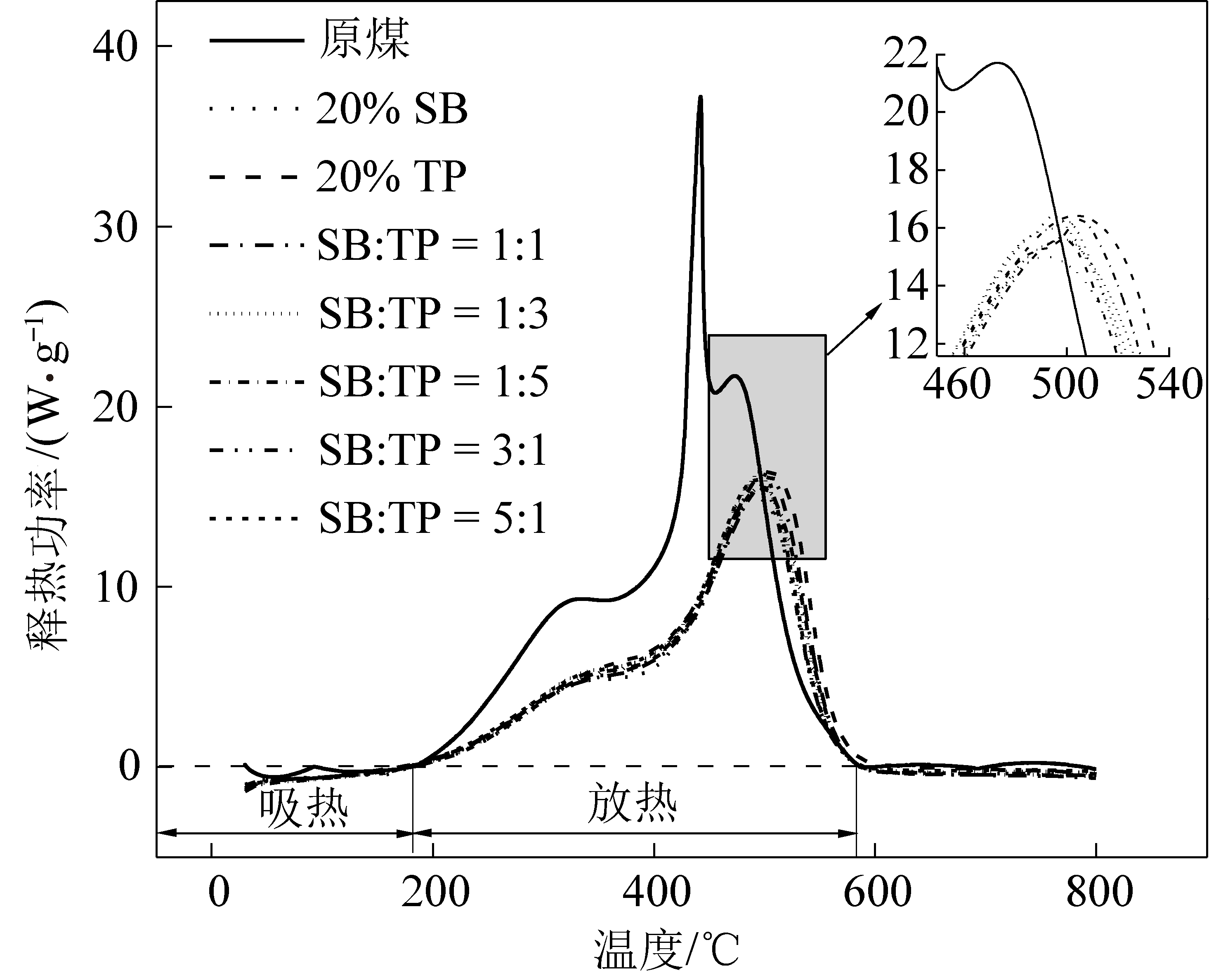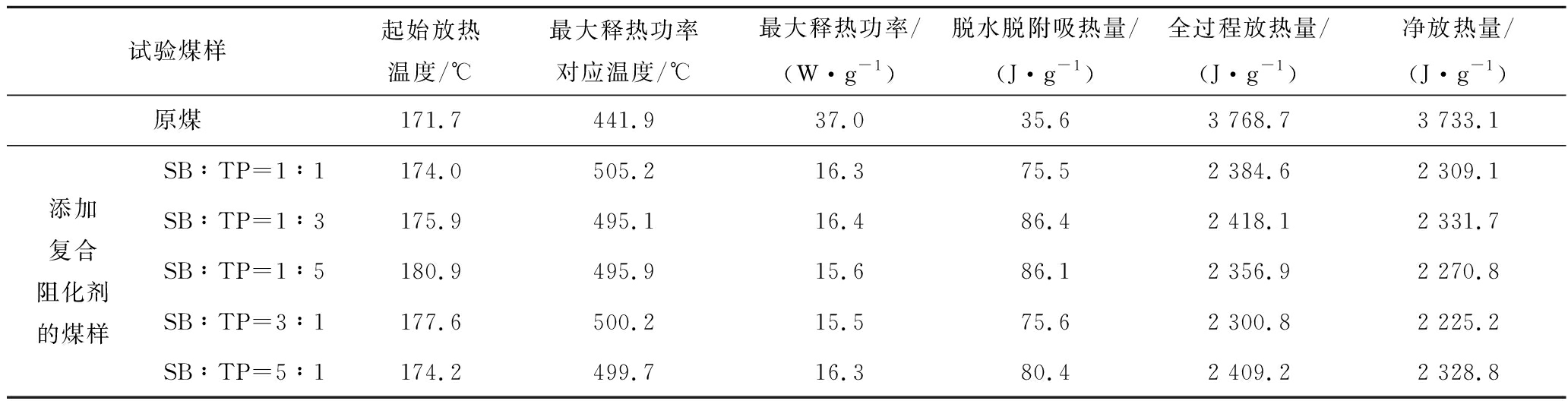 试验煤样起始放热温度/℃最大释热功率对应温度/℃最大释热功率/(W·g-1)脱水脱附吸热量/(J·g-1)全过程放热量/(J·g-1)净放热量/(J·g-1)原煤171.7441.937.035.63 768.73 733.1添加复合阻化剂的煤样SB∶TP=1∶1174.0505.216.375.52 384.62 309.1SB∶TP=1∶3175.9495.116.486.42 418.12 331.7SB∶TP=1∶5180.9495.915.686.12 356.92 270.8SB∶TP=3∶1177.6500.215.575.62 300.82 225.2SB∶TP=5∶1174.2499.716.380.42 409.22 328.8