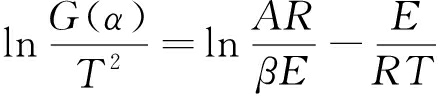 式中:α为转化率;A为指前因子;E为活化能,kJ/mol;β为升温速率,K/min;R为摩尔气体常量,8.314 J/(mol·K);T为反应温度,K;G(α)为机理函数,表示物质反应速率与转化率α之间所遵循的某种函数关系,代表了反应的机理。