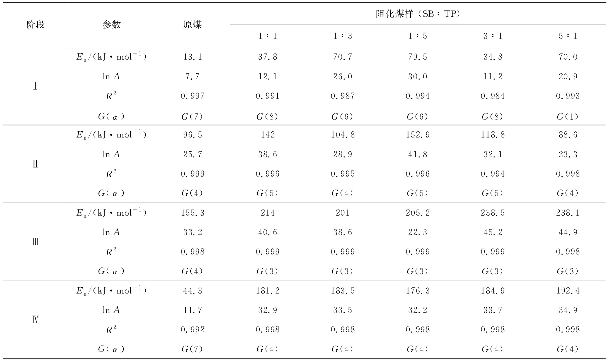 阶段参数原煤阻化煤样 (SB∶TP)1∶11∶31∶53∶15∶1ⅠEa/(kJ·mol-1)13.137.870.779.534.870.0ln A7.712.126.030.011.220.9R20.9970.9910.9870.9940.9840.993G(α)G(7)G(8)G(6)G(6)G(8)G(1)ⅡEa/(kJ·mol-1)96.5142104.8152.9118.888.6ln A25.738.628.941.832.123.3R20.9990.9960.9950.9960.9940.998G(α)G(4)G(5)G(4)G(5)G(5)G(4)ⅢEa/(kJ·mol-1)155.3214201205.2238.5238.1ln A33.240.638.622.345.244.9R20.9980.9990.9990.9990.9990.998G(α)G(4)G(3)G(3)G(3)G(3)G(3)ⅣEa/(kJ·mol-1)44.3181.2183.5176.3184.9192.4ln A11.732.933.532.233.734.9R20.9920.9980.9980.9980.9980.998G(α)G(7)G(4)G(4)G(4)G(4)G(4)