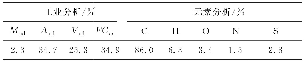 试验用碳酸氢钠和茶多酚样品均呈粉末状,纯度超过98%。煤样采用神东矿区海则庙煤矿不黏煤,试验煤样的工业分析和元素分析结果见表1,分别依据GB/T 212—2008及GB/T 476—2008测定。通过元素分析试验测定C、H、N、S元素的含量,并采用差减法计算得到O元素含量。对煤样进行粉碎过筛,取粒度为106~180 μm的煤样作为试验样品。