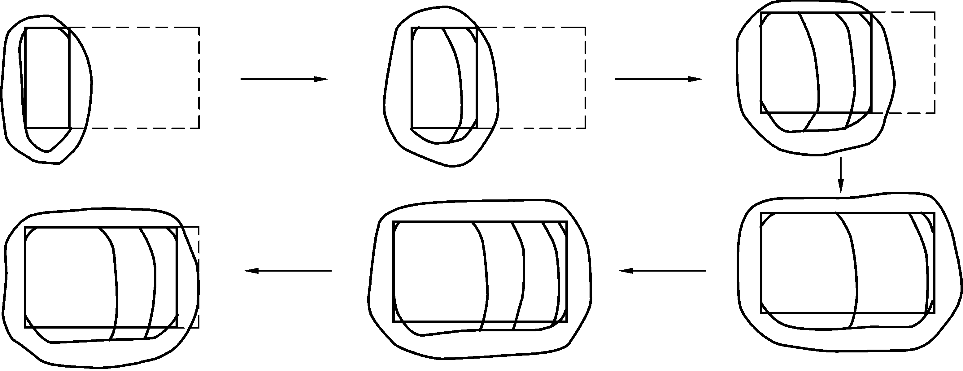 2)UAV/InSAR融合矿区地表裂缝提取方法。煤矿开采引起的地表裂缝的发育规律为(图5):裂缝均位于工作面外侧拉伸变形区,均由拉伸变形和正曲率变形引起,其基本形态是以工作面为中心的圆弧形或椭圆形。因此,煤矿地表裂缝的发育区域和形态特征均可作为先验知识,基于此,建立先验知识模型,以含有光谱特性的UAV光学影像为主,含有地物强度信息的InSAR影像为辅助修正,通过二者融合提高裂缝提取精度;利用UAV/InSAR融合影像数据,通过掩膜技术去除干扰,采用特征提取算子提取矿山地表裂缝,形成基于先验知识模型的矿区地表裂缝提取方法。具体步骤:首先,根据地裂缝与其他地物在光谱、几何特征和区域特征上的差异,采用掩膜技术去除部分干扰;然后,基于掩膜结果,利用边缘检测算子(如Canny算子和SIFT算子)提取圆弧形或椭圆形线性特征,去除不具有该线性特征的地表形态;最后,根据裂缝提取结果,对于散乱小裂缝等进行人工修正,得到符合发育规律的矿区地表裂缝信息。