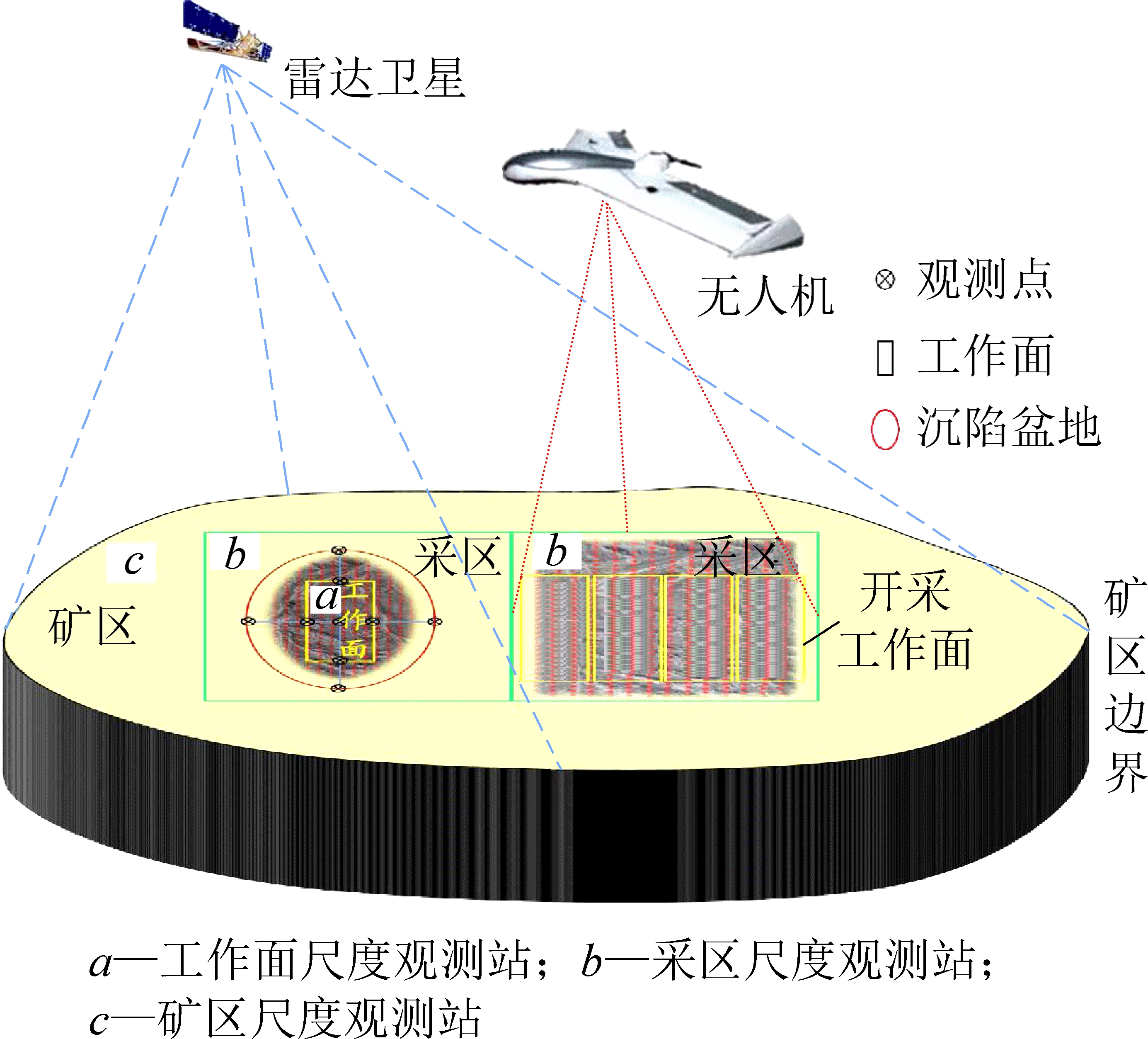 虽然UAV与InSAR技术在矿山开采变形监测应用中也各有不足,单独采用其中一种技术目前均无法完整地监测整个地表沉陷盆地信息。然而,二者优势互补:UAV弥补了InSAR无法提取沉陷盆地大变形的问题,InSAR弥补了UAV在监测沉陷盆地边缘误差大的问题;UAV获取的多(高)光谱影像数据,在矿区环境因素监测方面具有很大优势,弥补了SAR影像中缺少地物光谱特性的问题;两种影像融合,可以获得同时包涵地物后向散射强度、相位信息及地物光谱特性的影像,即可完整提取沉陷盆地整体形态,也可提高矿区环境损害监测能力。基于此,提出融合UAV/InSAR技术进行矿区多尺度开采损害监测,实现矿区关键地质与环境损害信息精准提取,建立新形势下集地表沉陷(地表形变)与环境损害为一体的综合监测理论、技术与方法体系,以适应西部大规模、高强度开采地质环境损害监测需求。