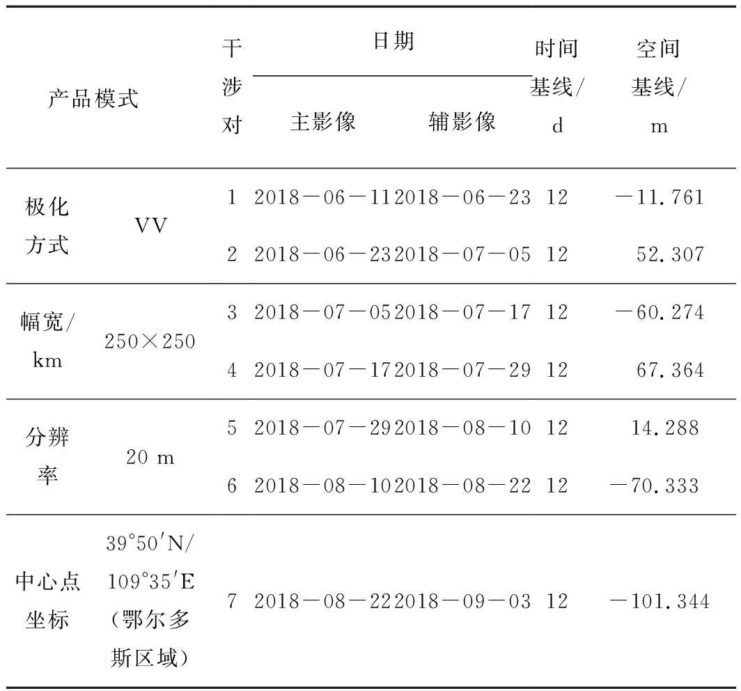 产品模式干涉对日期主影像辅影像时间基线/d空间基线/m极化方式VV12018-06-112018-06-2312-11.76122018-06-232018-07-051252.307幅宽/km250×25032018-07-052018-07-1712-60.27442018-07-172018-07-291267.364分辨率20 m52018-07-292018-08-101214.28862018-08-102018-08-2212-70.333中心点坐标39°50'N/109°35'E(鄂尔多斯区域)72018-08-222018-09-0312-101.344