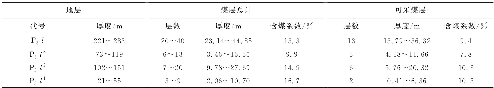 地层代号厚度/m煤层总计层数厚度/m含煤系数/%可采煤层层数厚度/m含煤系数/%P3 l221~28320~4023.14~44.8513.31313.79~36.329.4P3 l373~1196~133.46~15.569.954.18~11.667.8P3 l2102~1517~209.78~27.6914.965.76~20.3210.3P3 l121~553~92.06~10.7016.720.41~6.3610.3