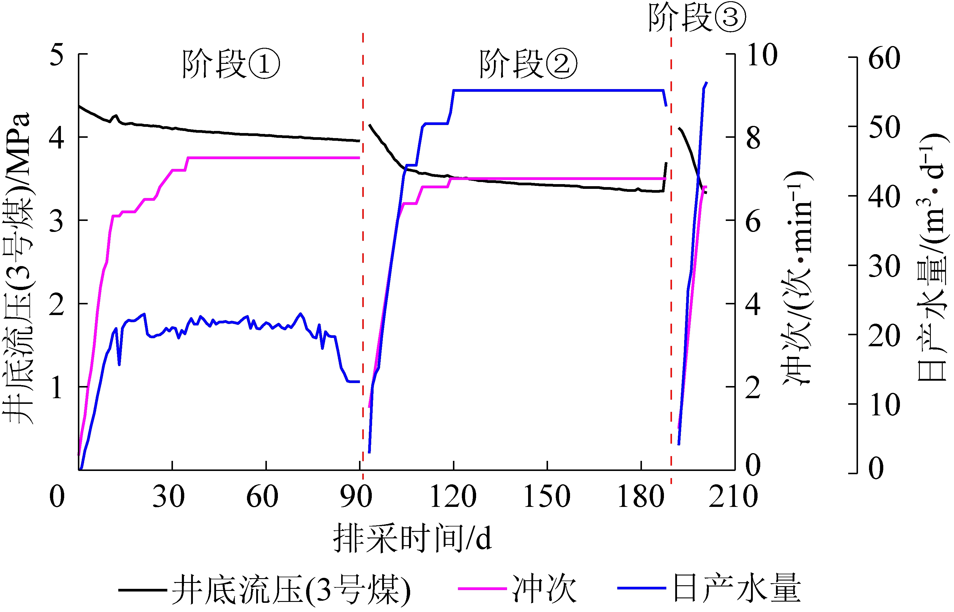 1)2019-12-25采用游梁式抽油机+38 mm管式泵进行排采,开抽时3号煤层流压4.370 MPa,持续上调冲次后,产水最大达到23 m3/d,流压下降较慢。