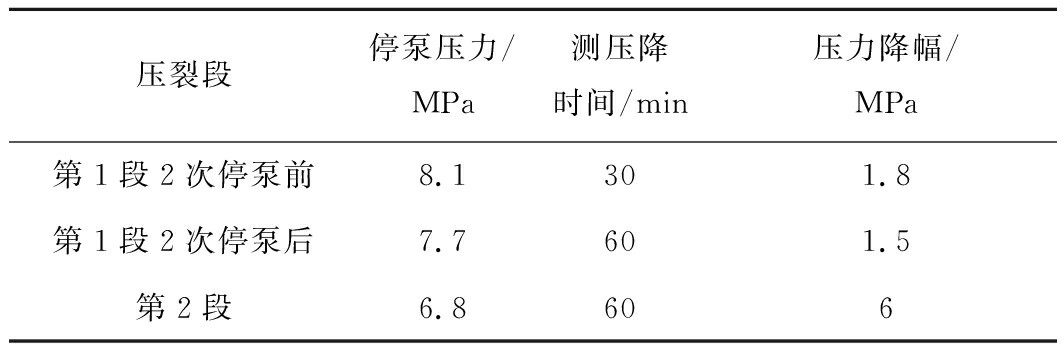 压裂段停泵压力/MPa测压降时间/min压力降幅/MPa第1段2次停泵前8.1301.8第1段2次停泵后7.7601.5第2段6.8606