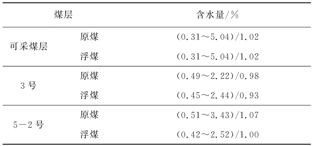煤层含水量/%可采煤层原煤(0.31~5.04)/1.02浮煤(0.31~5.04)/1.023号原煤(0.49~2.22)/0.98浮煤(0.45~2.44)/0.935-2号原煤(0.51~3.43)/1.07浮煤(0.42~2.52)/1.00