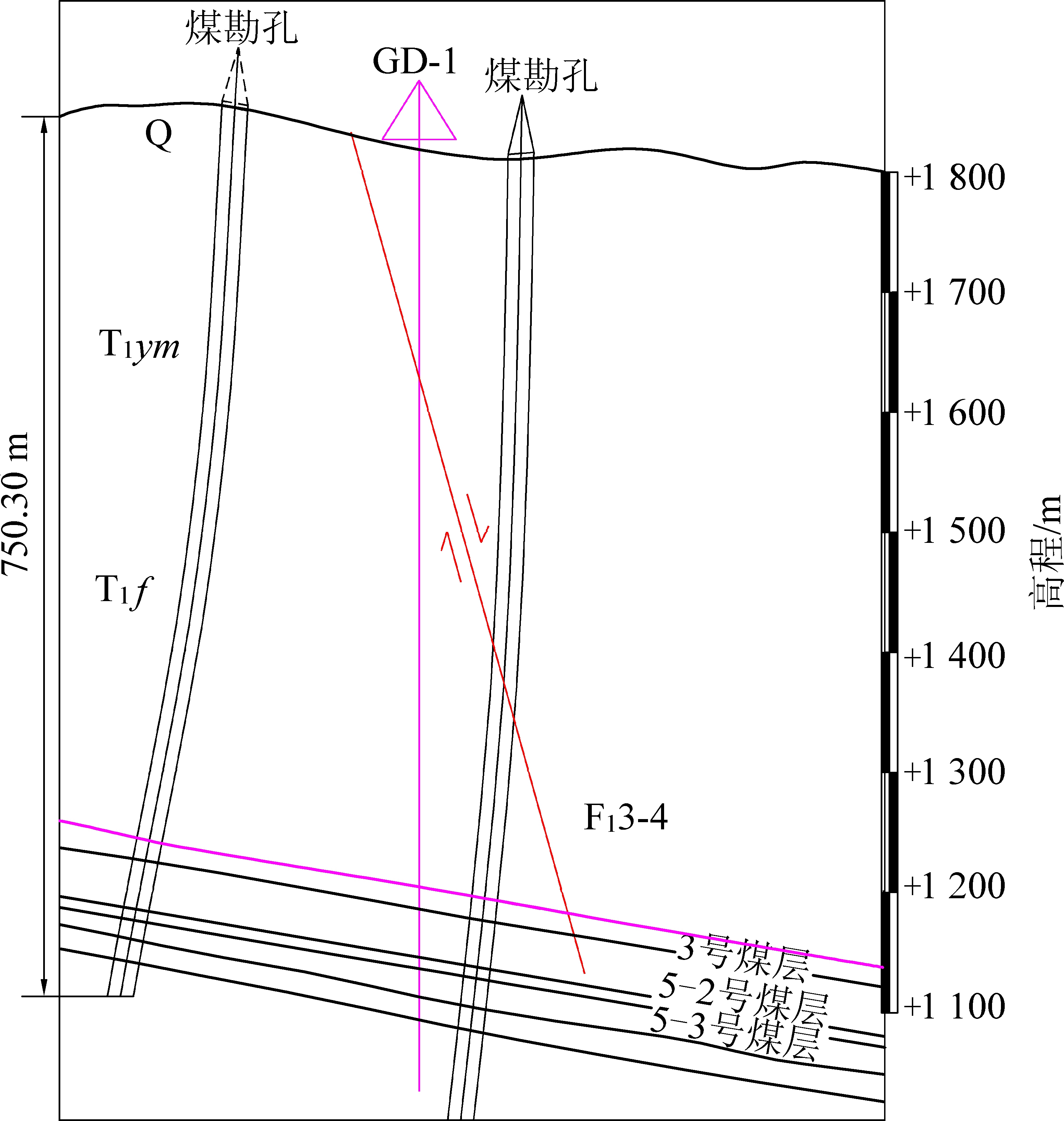 根据GD-1井周边煤勘孔钻井地质资料分析,GD-1井附近正断层未沟通至煤系地层,但结合GD-1井压裂施工与排采资料分析,正断层延伸至煤系地层沟通3号煤层,根据GD-1井周边煤勘孔预测的断层倾角分析断层距3号煤层150 m左右,在压裂施工过程中,3号煤层施工压力持续升高导致压裂裂隙沟通断层,为断层导水创造产出通道。该断层沟通地表,串联煤系地层上部飞仙关组、永宁镇组及第四系地层,而贵州飞仙关组、永宁镇组砂岩层岩溶较发育,含水性较高,为断层导水创造水源条件。GD-1井高产水为上覆含水地层的水井断层流向井筒,导致煤层气井高产水,其示意如图7所示。