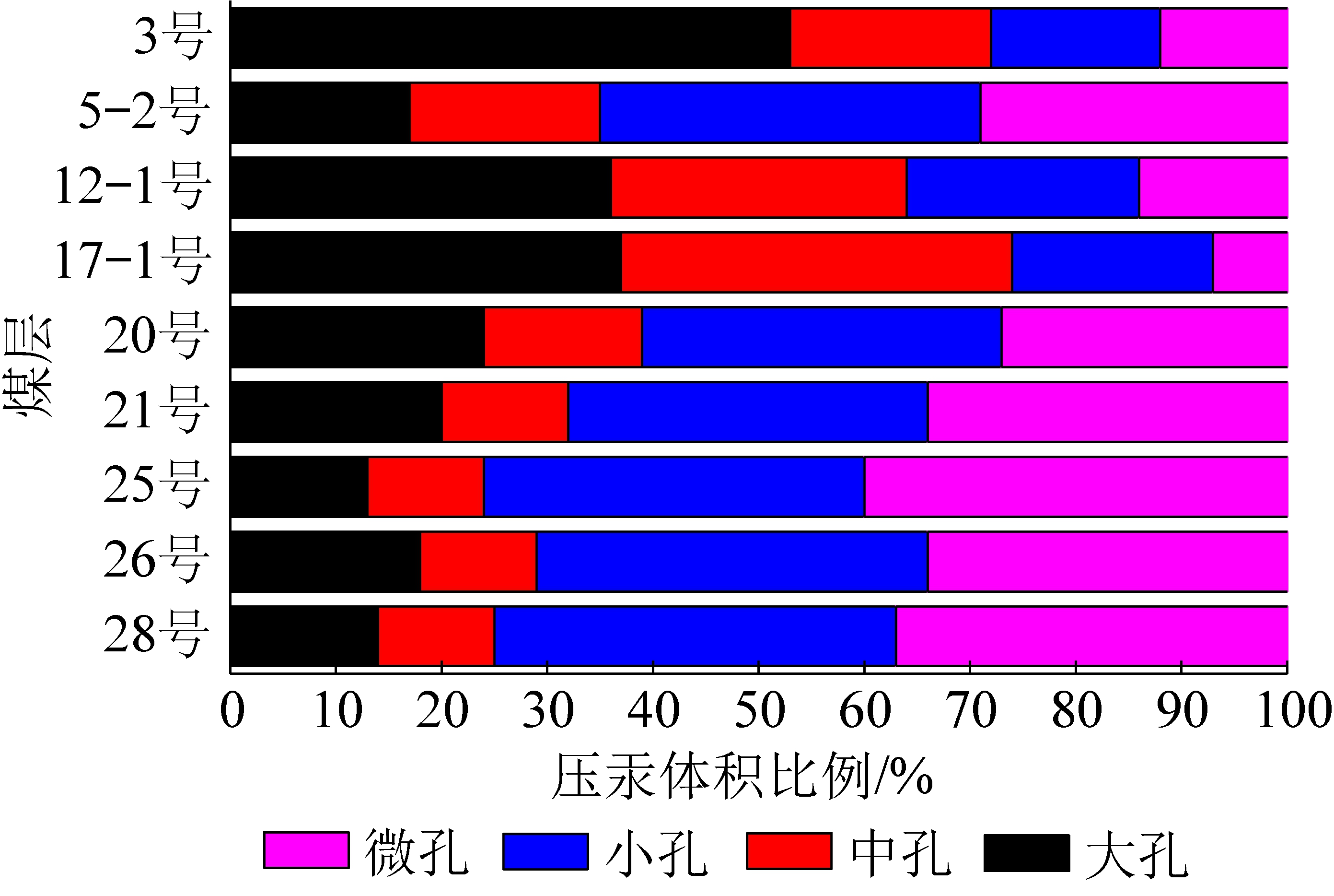 压汞测试结果显示,古德井区煤层平均孔隙度为6.54%,平均孔容为0.043 cm3/g,平均孔径为31.48 nm,平均表面积为5.33 m2/g。压汞测试各煤层煤样中不同尺度孔隙对总孔隙度的贡献显示(图2),3号、12-1号和17-1号煤样大孔和中孔对孔隙度的贡献率65%~75%,而其他煤层中大孔和中孔的贡献率仅在25%~40%。说明古德井区3号,12-1号煤样孔隙以大孔和中孔为主,这种孔隙结构有利于气体的渗流和产出,5-2号煤样孔隙以小孔和微孔为主,这种孔隙结构有利于气体的解吸和扩散。根据各煤层各参数的垂向变化发现特征,5-2号煤和12-1号煤孔隙参数孔隙度、孔容及平均孔径均较大,代表其孔裂隙发育程度较高,而3号煤层孔隙参数较低。古德井区2口参数井采取注入压降试井方法测试目的煤层的渗透率(表2),测试的3号、5-2号煤层均属于低渗透率储层。