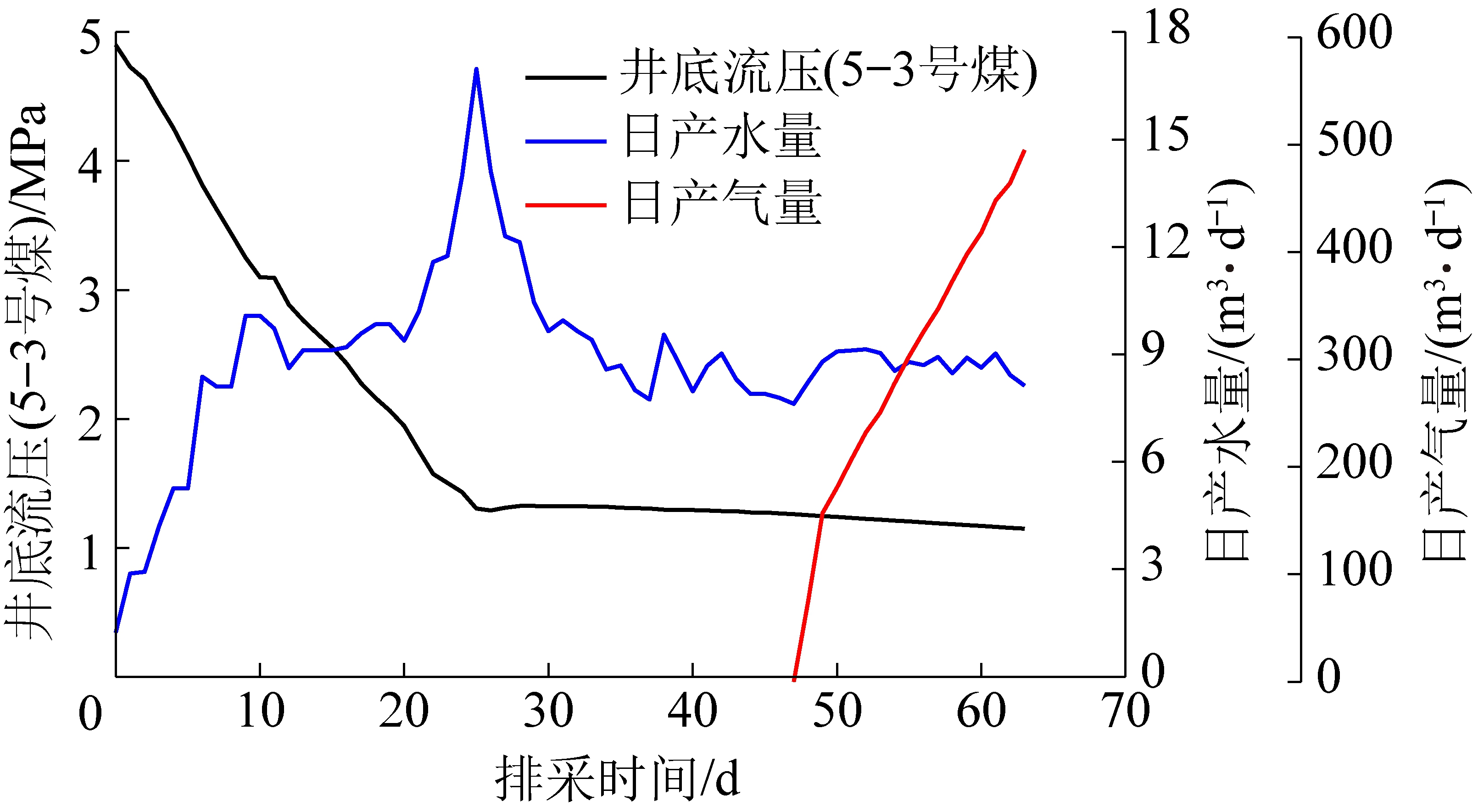针对该井而言,采取更大排水量的排采设备,可以对3号煤层进行排水降压,避免3号煤层的煤层气资源浪费,但3号煤层压裂沟通断层破碎带,该断层为开放性断层,煤层含气性受断层的影响,含气量较低,排采过程中3号煤层的产气贡献受到影响。3号煤层的产水量异常高,而5-2号、5-3号煤层的产水量较低,合层排采过程中,2个压裂段的产水量差异较大,排采相互干扰,影响合层排采的效果,不适宜进行合层排采。采取作业方式进行煤层堵水,封堵3号煤层的射孔孔眼,单独对5-2号、5-3号煤层进行排采,造成3号煤层的煤层气资源浪费,但该措施能够有效避免产水差异下的合层排采相互干扰,能够实现5-2号、5-3号煤层的排水、降压、解吸、产气,其独立可控程度较高,能够最大限度地对该压裂段进行排采。