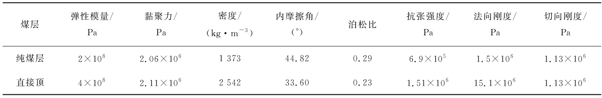 煤层弹性模量/Pa黏聚力/Pa密度/(kg·m-3)内摩擦角/(°)泊松比抗张强度/Pa法向刚度/Pa切向刚度/Pa纯煤层2×1082.06×1061 37344.820.296.9×1051.5×1061.13×106直接顶4×1082.11×1062 54233.600.231.51×10615.1×1061.13×106