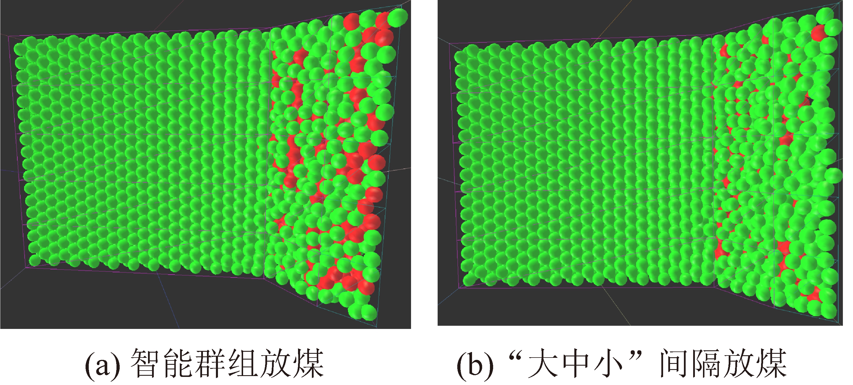 智能群组放煤通过对放煤口的智能决策控制,收获最大放煤收益,且顶煤采出率最高。“大中小”间隔放煤方式以“见矸关窗”为控制准则,其放煤方式较为保守,故顶板上方残存煤炭粒子偏多。2种放煤方式下顶板上方粒子分布如图6所示。