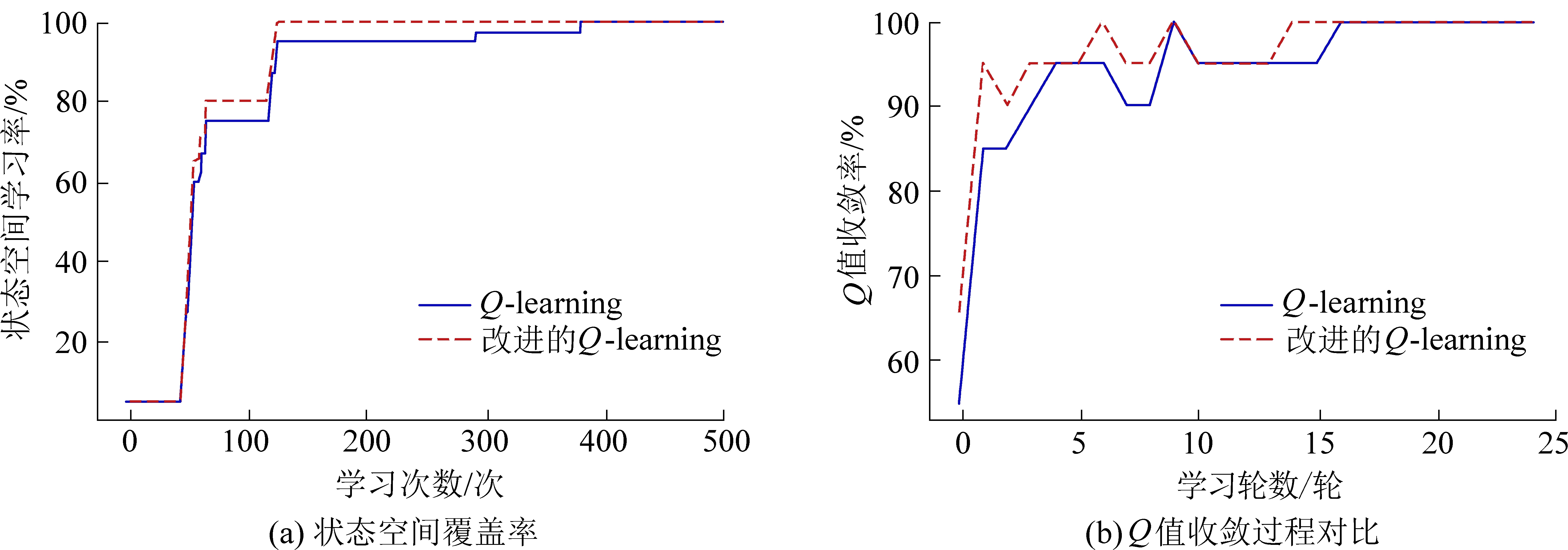 图2a共进行5轮学习,每轮Q值更新次数为100次。提出的批量式Q值更新算法在第2轮学习结束完成首次对全状态空间的学习,而Q-learning算法首次完成全状态空间学习在第4轮,采用批量式Q-learning算法使智能体对全状态空间的探索时间缩短了50%。