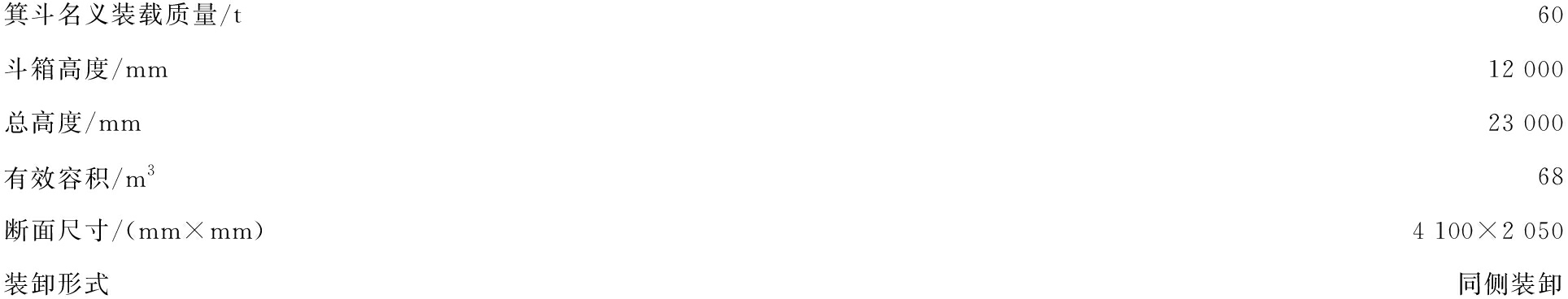 箕斗名义装载质量/t60斗箱高度/mm12 000总高度/mm23 000有效容积/m368断面尺寸/(mm×mm)4 100×2 050装卸形式同侧装卸