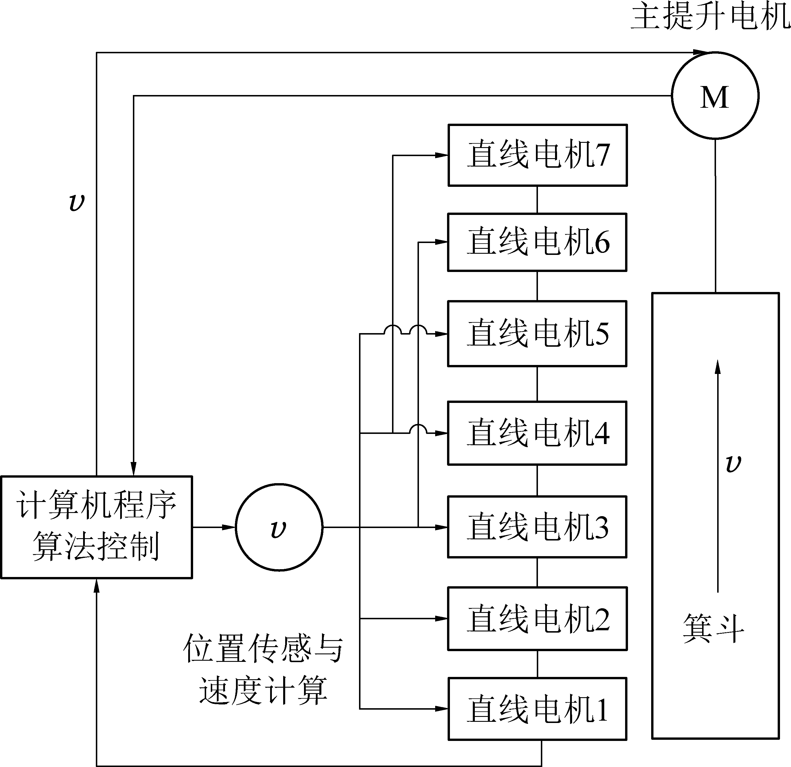 为保证辅助提升系统的稳定运转,设计了一种基于速度跟随的多电机同步控制策略,能够有效控制主电机与辅助提升电机之间以及多个辅助提升电机之间的速度误差和推力误差,有助于实现主提升电机和辅助提升电机对箕斗的协同驱动控制。