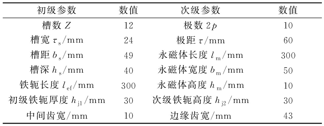 初级参数数值次级参数数值槽数Z12极数2p10槽宽τs/mm24极距τ/mm60槽距bs/mm49永磁体长度lm/mm300槽深hs/mm40永磁体宽度bm/mm50铁轭长度lef/mm300永磁体高度hm/mm10初级铁轭厚度hj1/mm30次级铁轭高度hj2/mm30中间齿宽/mm10边缘齿宽/mm43