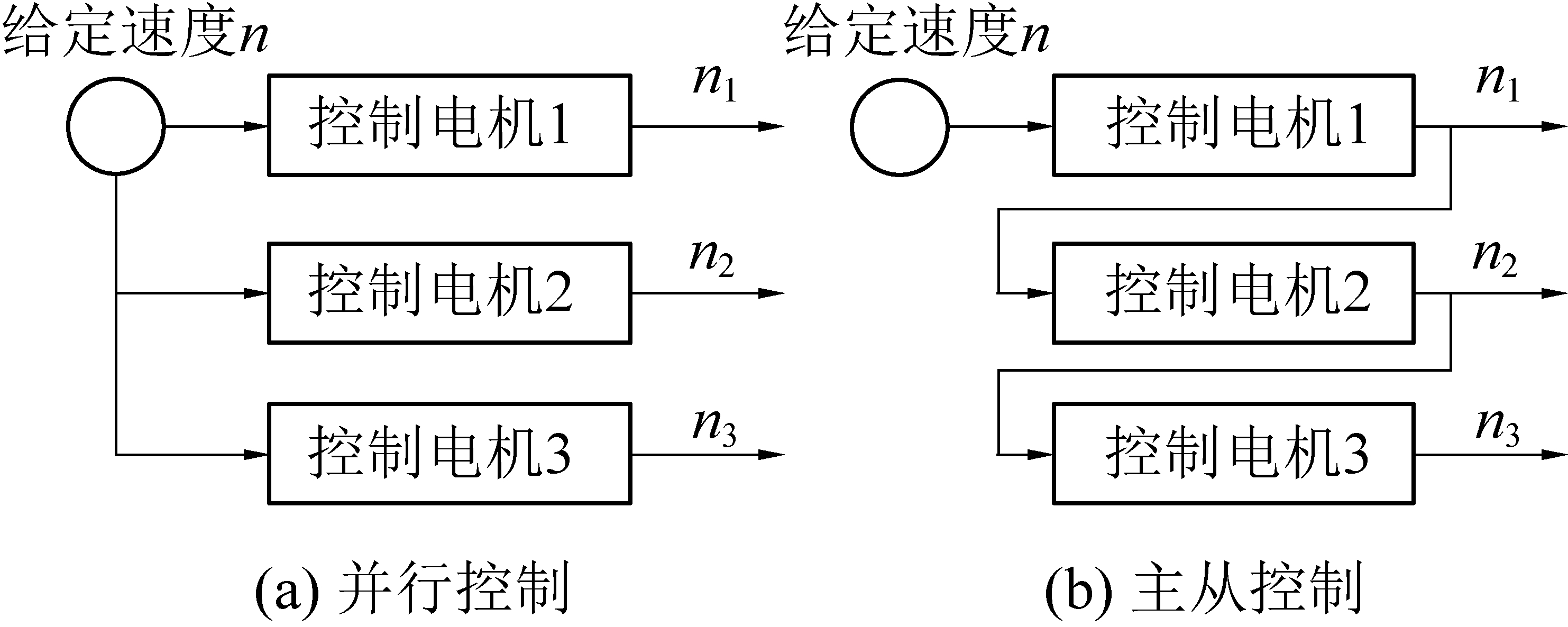 随着多电机同步控制应用场合的增加,目前多电机同步控制策略包括主从控制、并行控制、交叉耦合、智能算法等多种控制方式。设计的永磁直线电机辅助提升系统控制策略包括并行控制和主从控制2种同步控制方式,如图5所示。