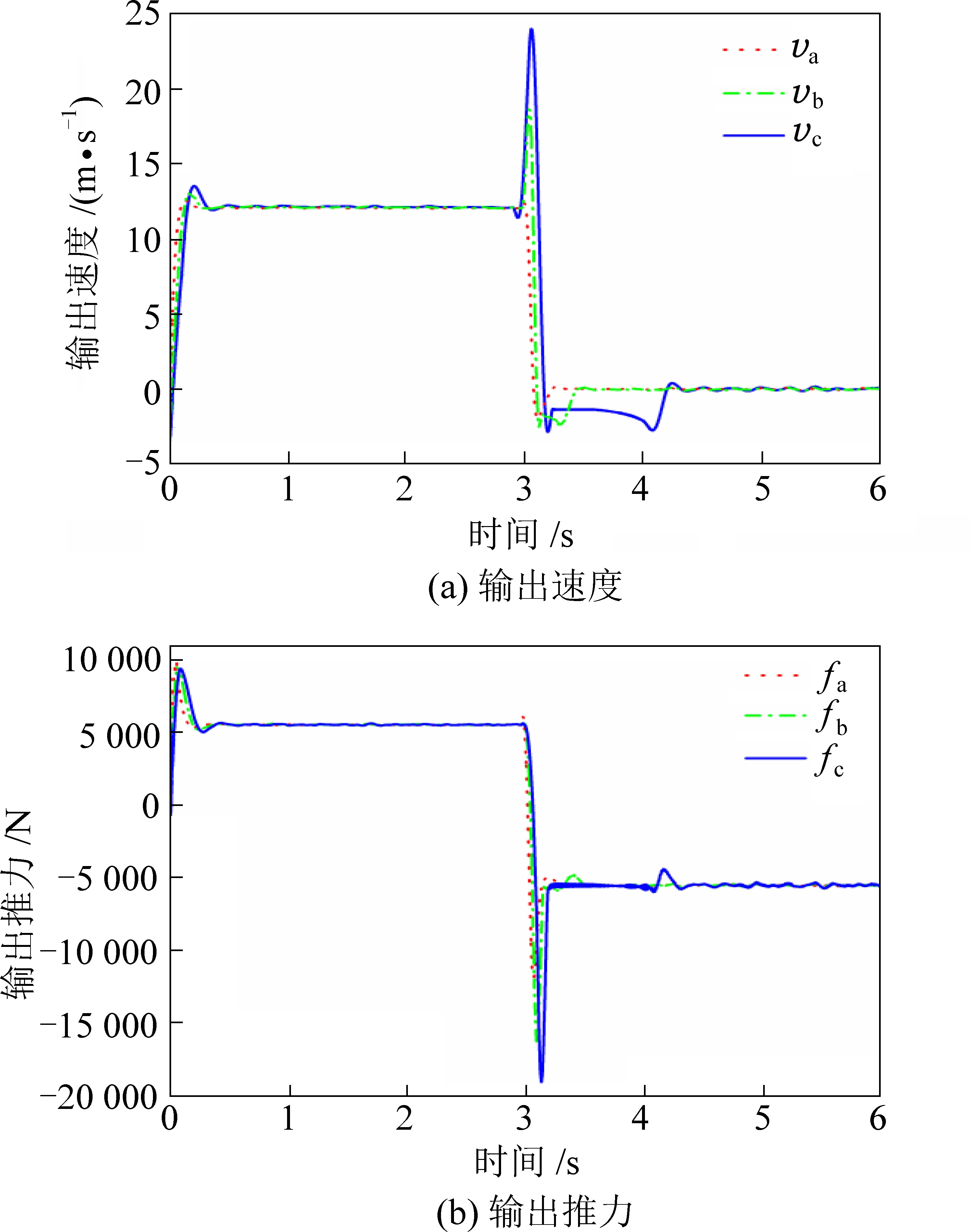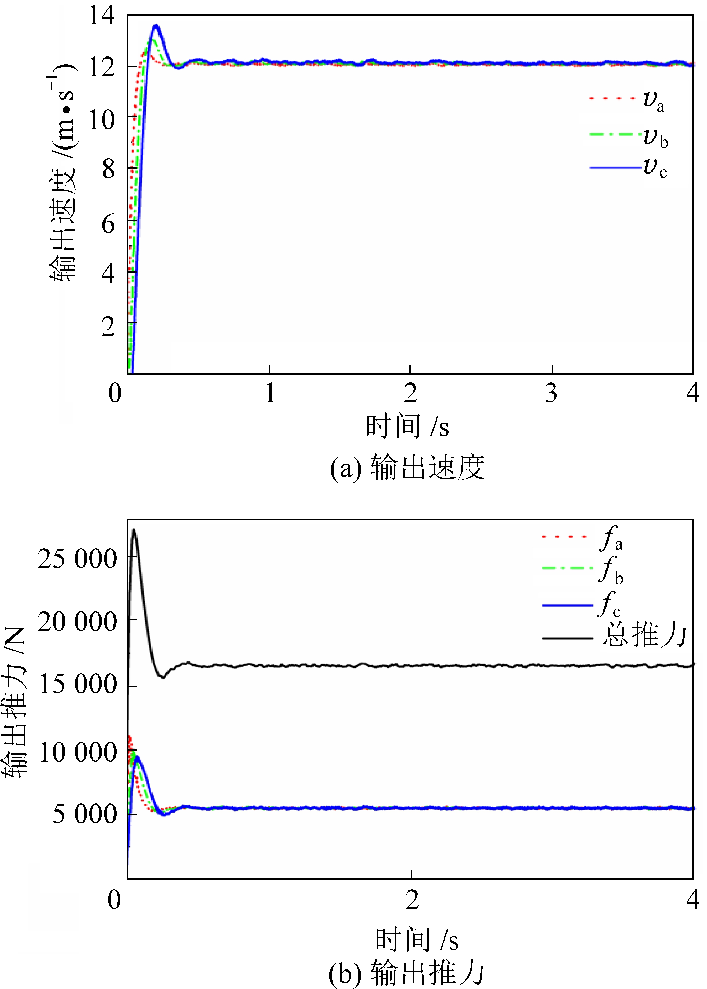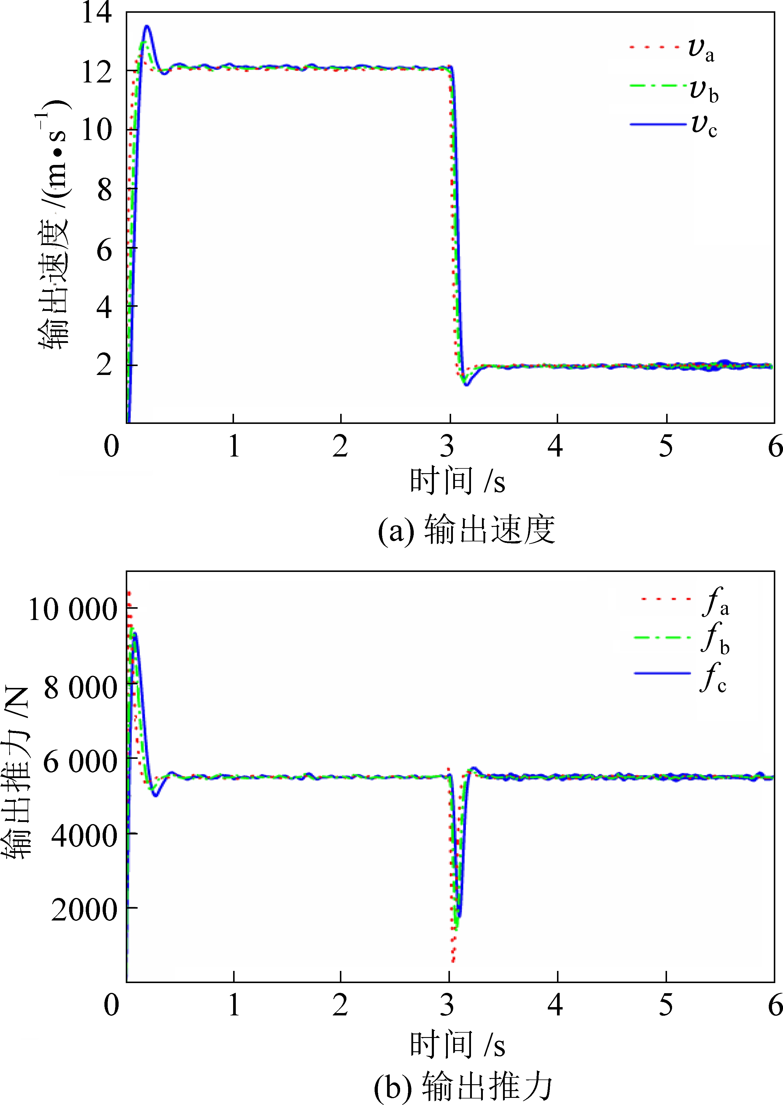 为验证电机控制系统在速度发生突变时电机的输出推力和速度跟随的稳定性,设定仿真试验为电机以12 m/s匀速运行3 s后,速度突变为2 m/s。仿真结果如图12a所示,电机在速度发生突变后速度跟随特性良好,a、b、c三电机在速度发生突变后分别在0.19、0.24、0.29 s将速度从12 m/s稳定运行至2 m/s,速度响应时间为0.15 s,超调量较小,突变后电机同步速度精度与突变前保持一致。由图12b可知,在速度突变后,a、b、c三电机输出推力在短时间内大幅度下降至567、1 389、1 483 N,并在0.12、0.16、0.21 s后再次进入稳定状态,推力响应时间为0.045 s,较速度响应时间快了0.105 s,三电机的输出推力进入稳定状态后发生的平均波动依次为0.76%、2.1%、1.3%,有效验证了速度突变后电机速度和输出推力良好的跟随特性和稳定性。
