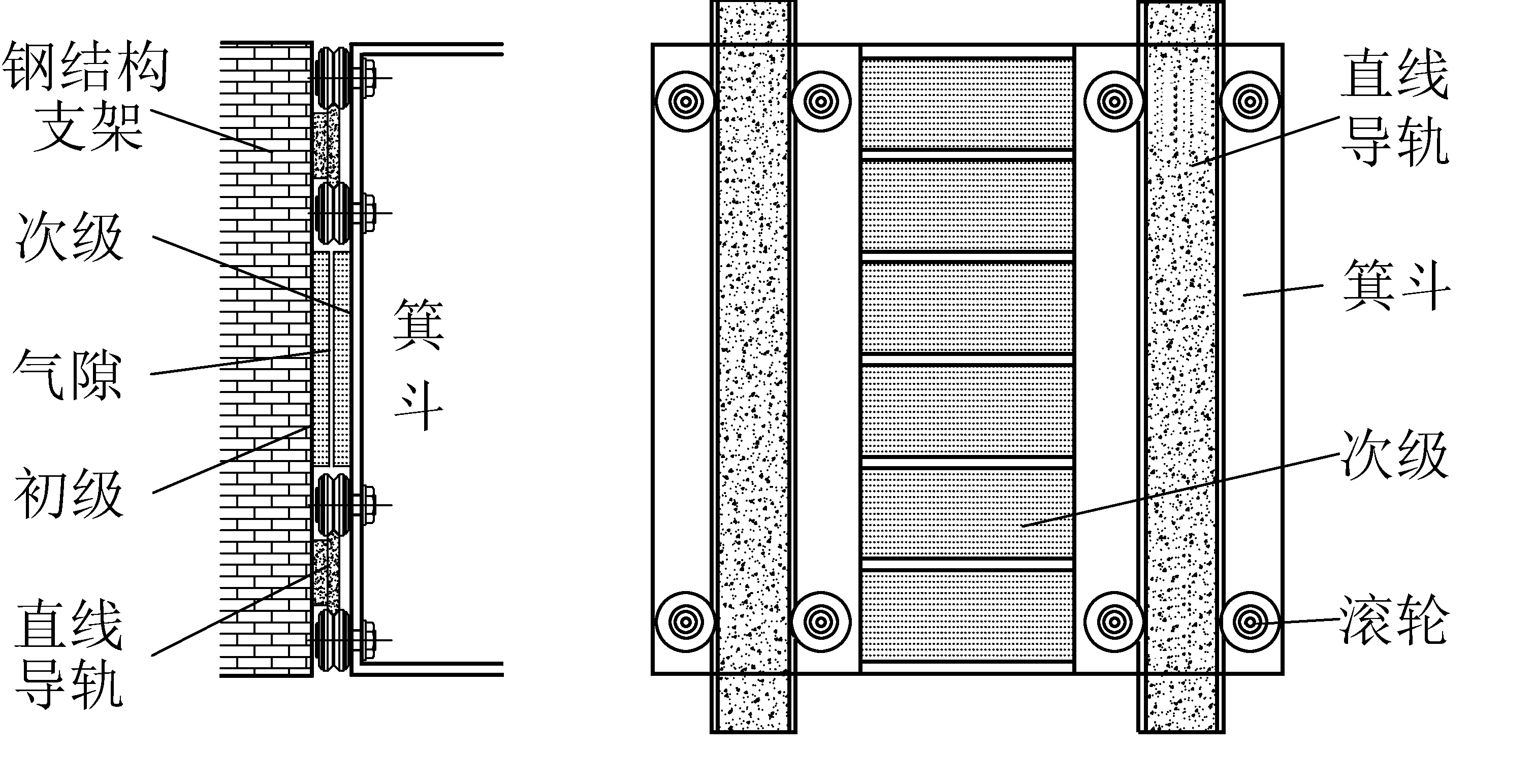 考虑到原有钢罐道难以支撑多个电机重量,将钢结构支架固定在井壁上代替原有钢罐道,内嵌式直线导轨以及直线电机初级则固定在该钢结构上,直线电机的次级以及滚轮则安装在箕斗本体上,具体结构简图如图2所示。通过钢丝绳牵引以及滚轮与直线导轨配合运动有助于防止箕斗侧倾,能够一定程度上保证电机气隙均匀稳定。