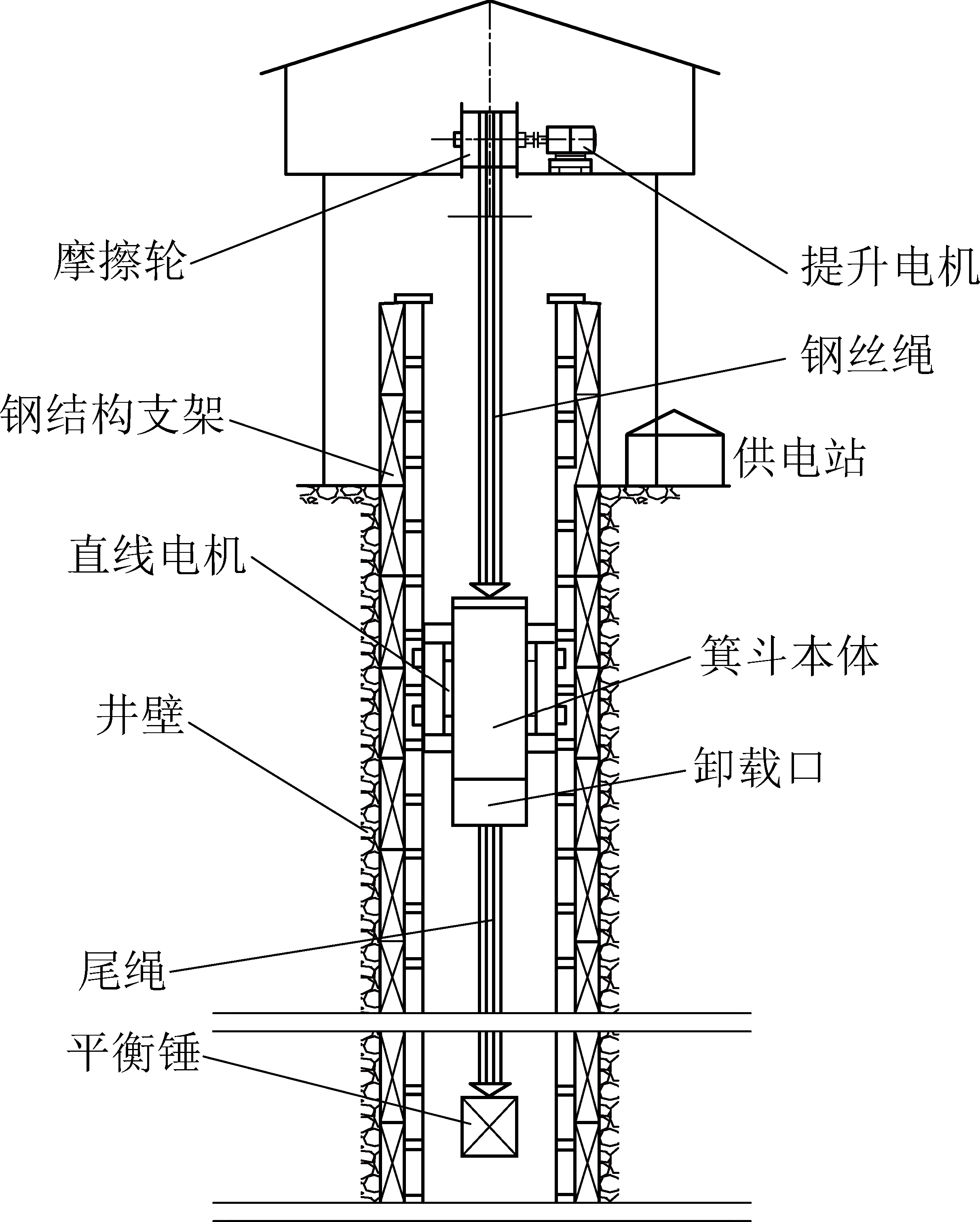 煤炭作为我国的基础能源,在能源消费中的比重虽连年下降,但在未来数十年内仍将处于能源消费的主导地位[1-2]。随着浅层煤炭资源的不断开采,未来矿井提升系统朝着特大型超深井方向发展成为必然需求。为实现煤炭资源深部化、大型化开采[3],对大型和特大型容器提升设备进行改造和应用成为亟须考虑的问题[4]。箕斗作为煤矿立井提升系统主要运煤设备[5],国内矿用箕斗的单次最大提升负载已达到50 t[6],但是随着箕斗吨位增加与提升深度变大,矿井提升设备的性能会越来越差[7],其中最重要的问题是钢丝绳在复杂工况下因交变载荷影响而导致的疲劳失效,进而导致钢丝绳寿命大幅降低[8-9]。例如,2012年9月,甘肃省某煤矿在副井井筒人车提升过程中就发生了钢丝绳断裂事故,导致20人死亡。而加长加粗钢丝绳又会导致外载荷的增加,难以从根本上解决问题,极大限制了大吨位箕斗的提升能力和提升效率。20世纪90年代,河南理工大学首次提出直线电机矿井提升系统,并开始了结构设计、电磁参数分析、控制系统设计等一系列研究,但依据现有直线电机技术,其承载能力不高,且多用于水平驱动,难以直接将其应用到矿井提升系统上[10-11]。