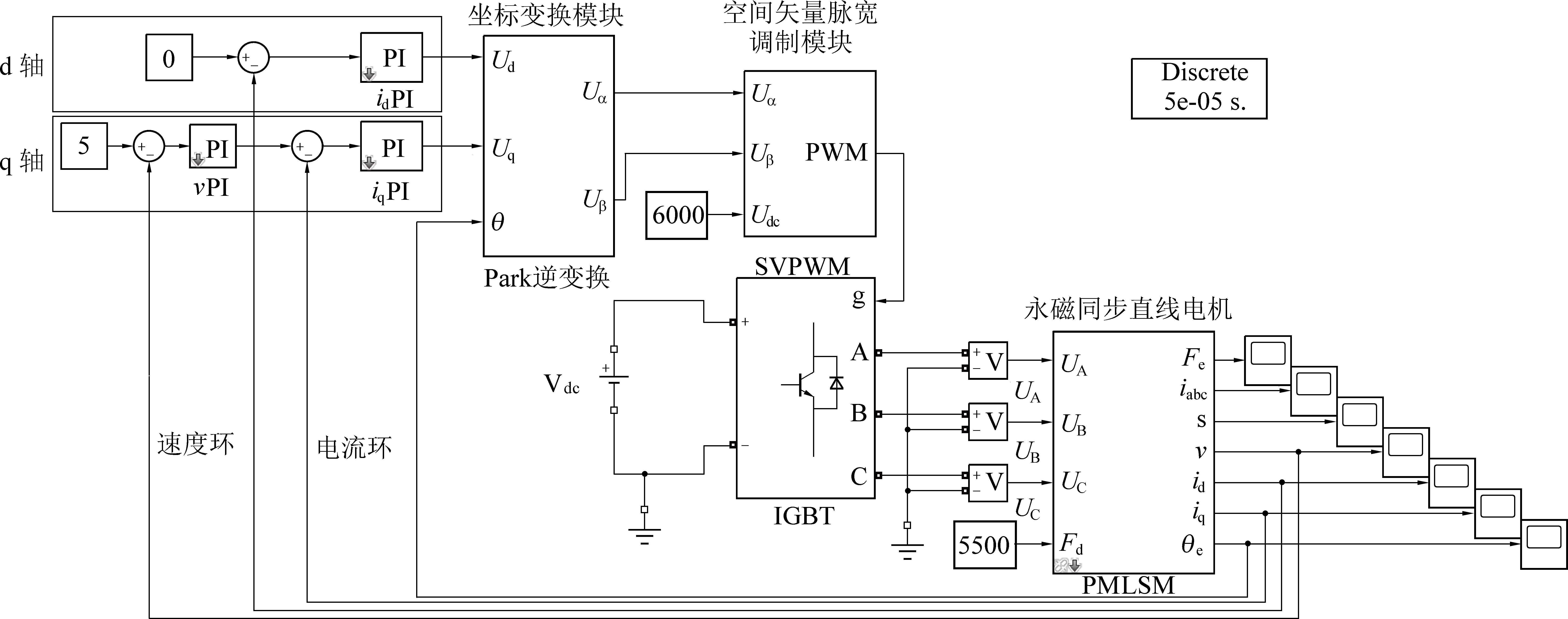 其中坐标变换模块包含在永磁电机模块之内,图中未明显标出,各个模块不断进行数据调节实现闭环控制,通过改变输入输出参数实现对整个模型在不同工况下模拟仿真[19-20]。文中采用的是id=0的双闭环矢量控制,该方法下电磁推力仅与输出电流iq成正比,因此id的目标值为0,id(d轴电流)经过idPI(电流调节器)输出值为Ud(d轴电压)。目标速度v经过vPI(速度调节器)输出值为iq(q轴电流),iq再经过iqPI(电流调节器)输出值为Uq(q轴电压)。因此速度v最终是通过控制电压Ud、Uq实现的。Ud、Uq(两相旋转坐标系下的电压)可以通过坐标变换模块转换为Uα、Uβ(两相静止坐标系下的电压),而Uα、Uβ的矢量和与UA,UB,UC(三相静止坐标系下的电压)的矢量和是相等的,因此若想产生需要的Ud、Uq最终需要产生相应的三相正弦电压UA,UB,UC。而三相正弦电压UA,UB,UC采用空间矢量脉冲调制(SVPWM)算法通过PWM控制功率器件(IGBT)的开关顺序和开关脉冲大小,将直流电压Udc逆变成三相正弦电压UA,UB,UC。将该电压通入永磁同步直线电机(PMLSM),电机即可产生克服负载Fd达到目标转速v所需要的励磁电流(id)和转矩电流(iq),此时电机的输出转矩为Fe。通过电流AD采样和编码器可分别对实际输出电流ia、ib、ic和速度v进行测量,其中ia、ib、ic可通过坐标变换转换成电流id,iq,从而形成电流闭环;目标速度v可与目标转速形成速度闭环。