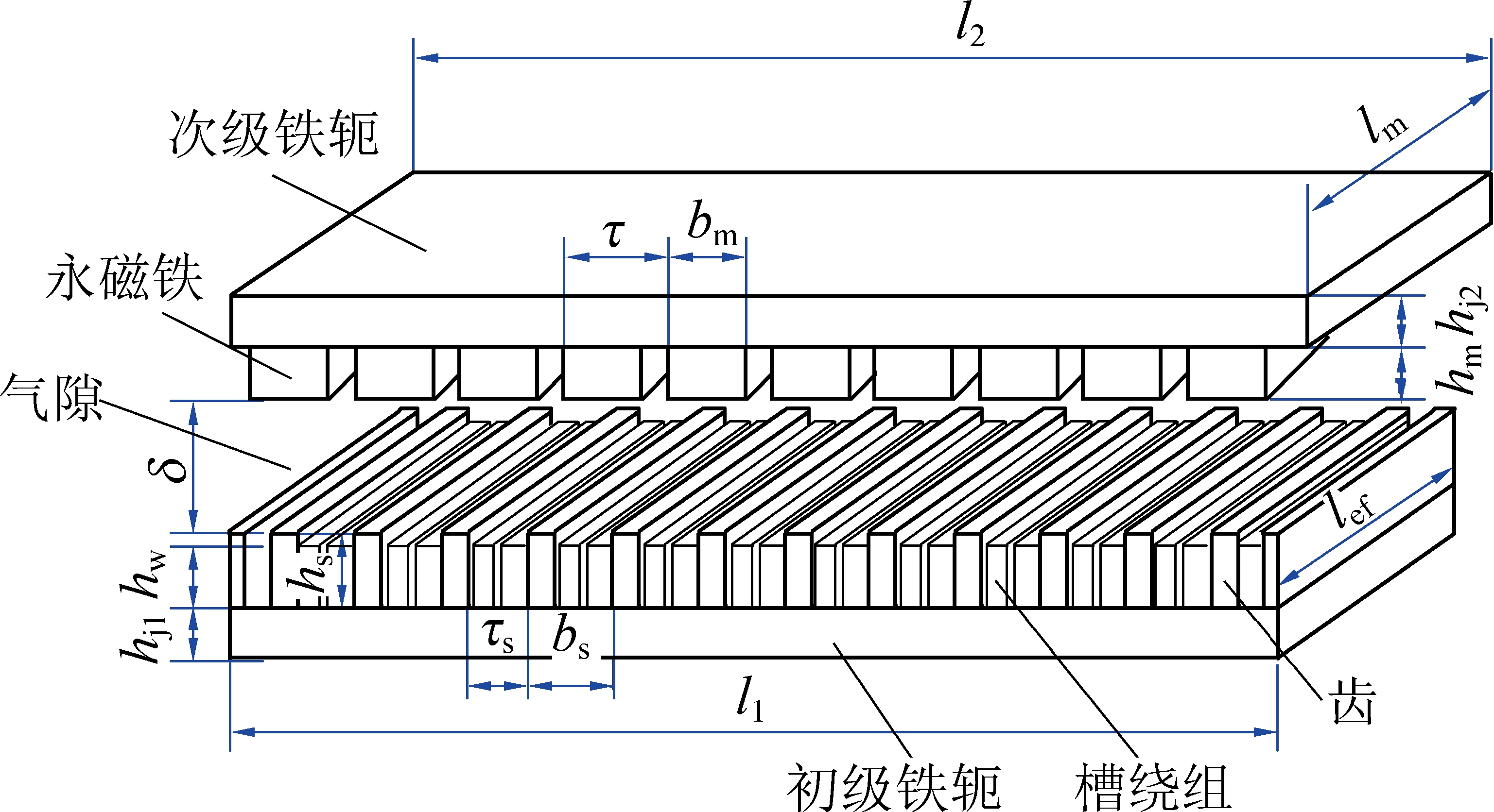 针对矿井超深井行程长、推力大的运输工况,直线电机选用次级无需与供电缆相连的动磁钢型初级分段永磁直线同步电机,如图3所示。采用单边PMLSM双侧辅助驱动,两侧直线电机对称分布理论上能够有效抵消法向电磁力对箕斗的作用力,同时保证系统推力的稳定性,实现左右推力平衡,但不可避免需要对箕斗增设加强筋,增加箕斗牢固性。