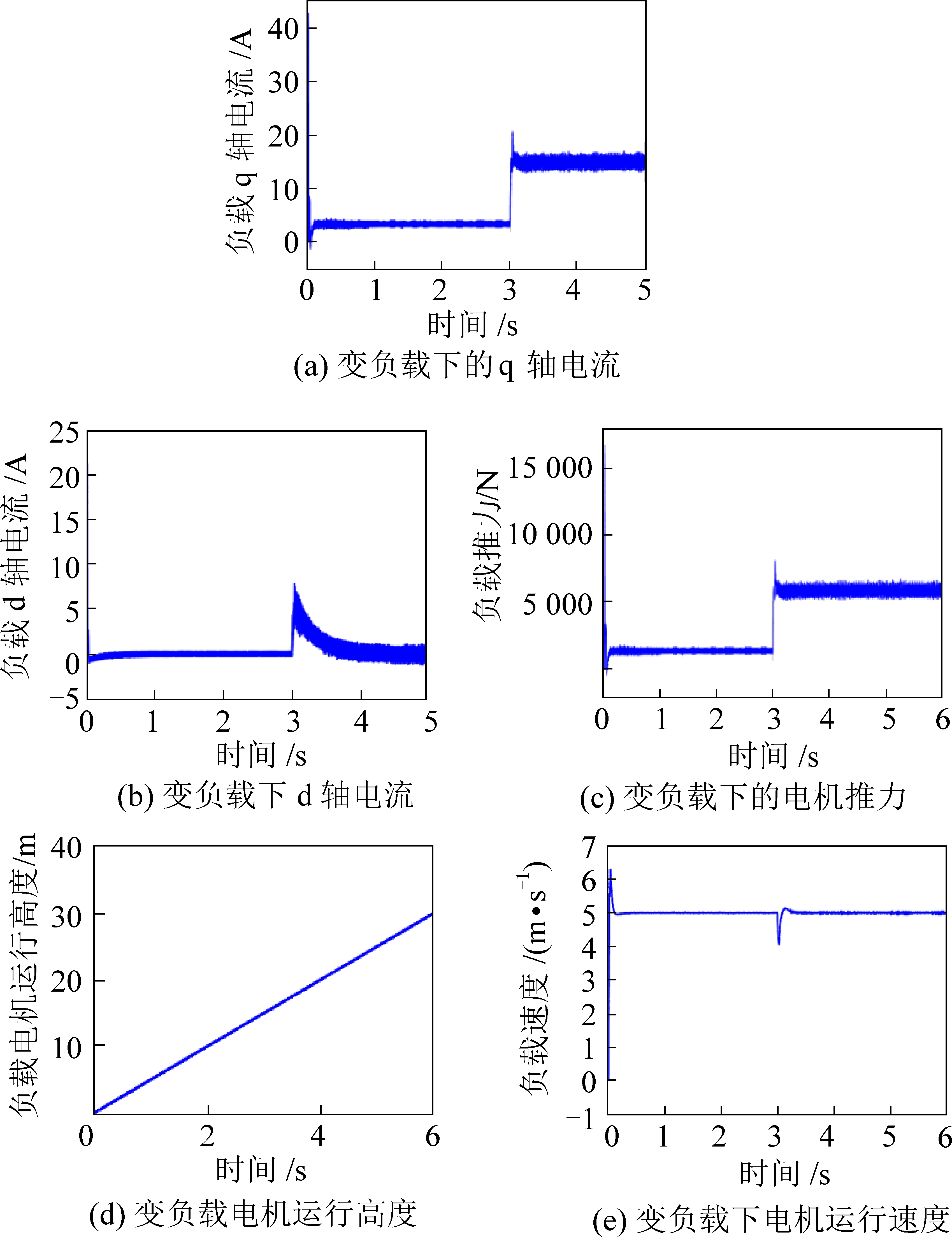 结果表明在所施加的负载突变后,q轴电流由3 A变为16.5 A,id=0控制结果较为理想,电机速度能够在短暂减少后迅速恢复到5 m/s,响应速度较快,仅有较小超调量,验证了系统的稳定性。同时可分析出,负载突变后电流、电机推力、运行速度幅值变化有所增加是由于电机内部参数变化增大而PI调节器性能较差引起的。