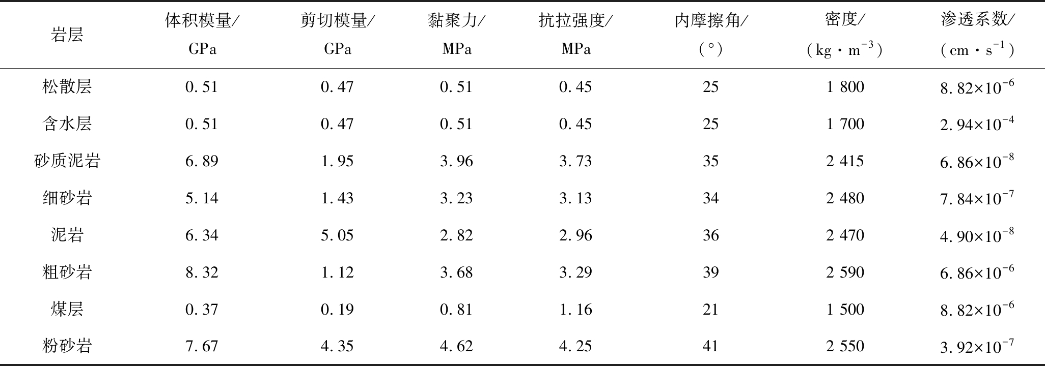 岩层体积模量/GPa剪切模量/GPa黏聚力/MPa抗拉强度/MPa内摩擦角/(°)密度/(kg·m-3)渗透系数/(cm·s-1)松散层0.510.470.510.45251 8008.82×10-6含水层0.510.470.510.45251 7002.94×10-4砂质泥岩6.891.953.963.73352 4156.86×10-8细砂岩5.141.433.233.13342 4807.84×10-7泥岩6.345.052.822.96362 4704.90×10-8粗砂岩8.321.123.683.29392 5906.86×10-6煤层0.370.190.811.16211 5008.82×10-6粉砂岩7.674.354.624.25412 5503.92×10-7