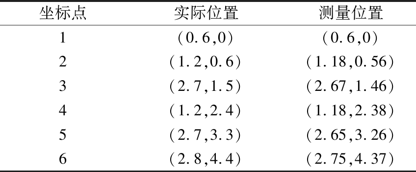 坐标点实际位置测量位置1(0.6,0)(0.6,0)2(1.2,0.6)(1.18,0.56)3(2.7,1.5)(2.67,1.46)4(1.2,2.4)(1.18,2.38)5(2.7,3.3)(2.65,3.26)6(2.8,4.4)(2.75,4.37)