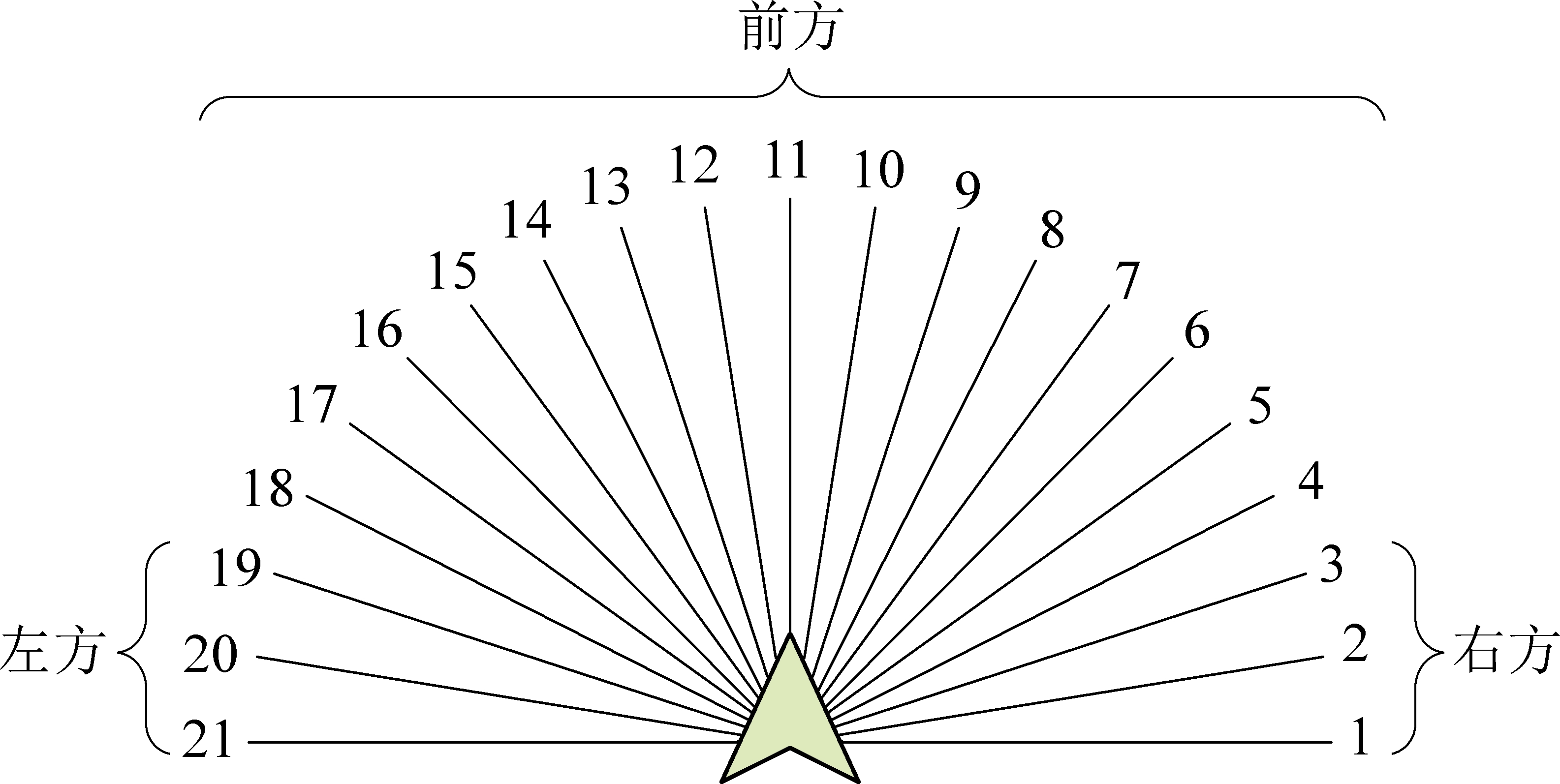 通过激光雷达传感器实现机器人的避障,由激光测距的原理可知,在激光雷达旋转一周的过程中,激光发射头会等时间间隔发射激光(每束激光的间隔角度相等),假定激光雷达旋转一周后,激光发射头总共发射了360束激光,则每束激光的间隔角度为1°,这样就可以划分所有的激光束,使之对应机器人前后左右的方位,如图8所示,定义1~3激光束扫描的位置为机器人右方,4~18激光束扫描的位置为机器人前方,19~21激光束扫描的位置为机器人的左方。