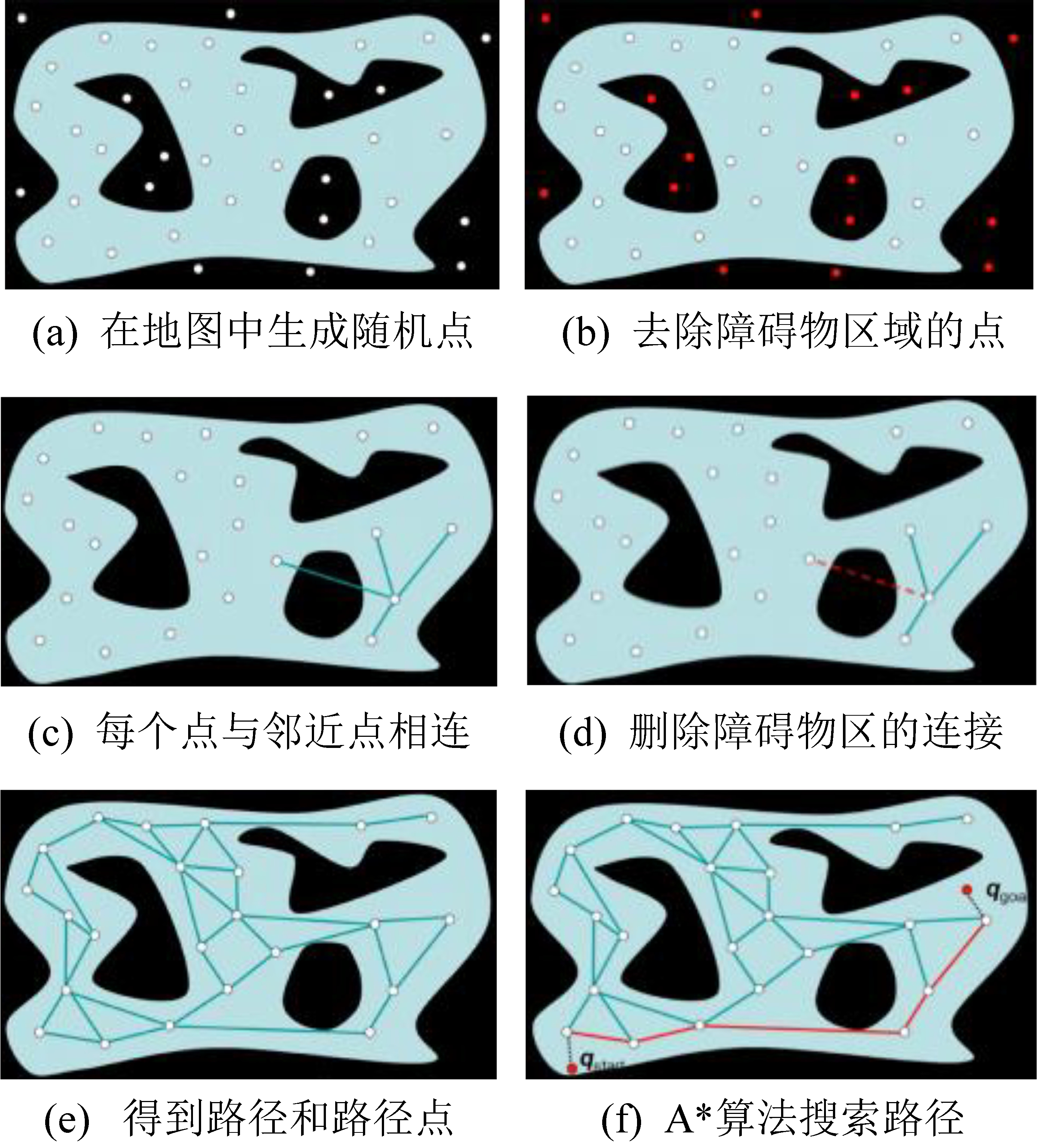 PRM是一种基于图搜索的算法,它将连续空间转换成离散空间,再利用A*等搜索算法在路线图上寻找路径[9],在图6中PRM算法运行过程分为6个步骤,前5个步骤为离线学习阶段,第6个步骤为查询阶段。离线学习阶段主要内容是在给定地图的自由空间内生成N个随机点,在每个随机点的周围选取邻域点,把随机点和它的所有邻域点相连,并去掉穿过障碍物区域的连线,由此得到一个无向路径网络图G=(V,E),其中其中V为节点集,E为所有可能的两点之间的路径集。查询阶段主要内容是根据学习阶段构造的无向网络路径图,采用某种搜索算法,如A*算法,广度优先搜索算法等,在起点和终点之间搜索出无碰撞的路径。