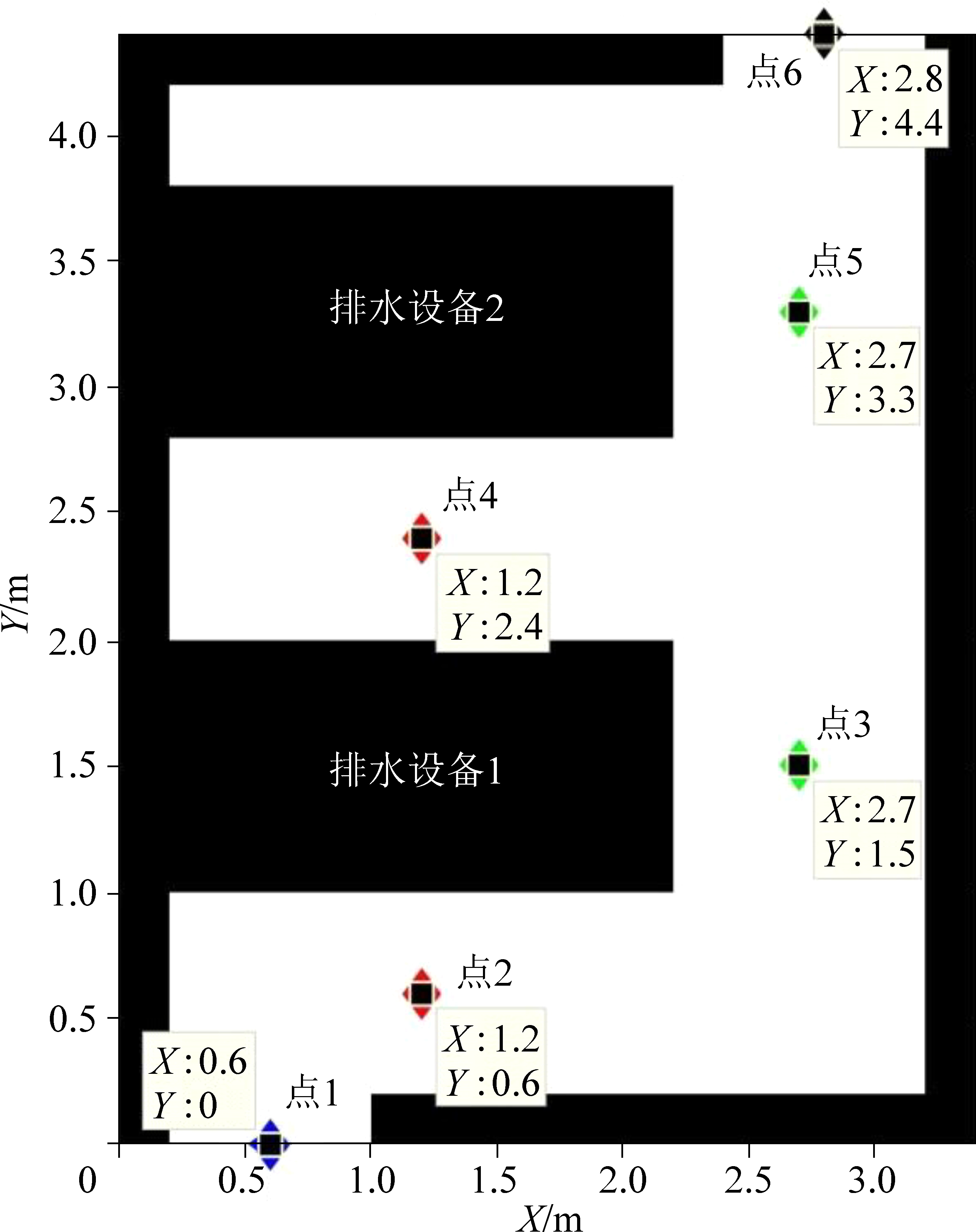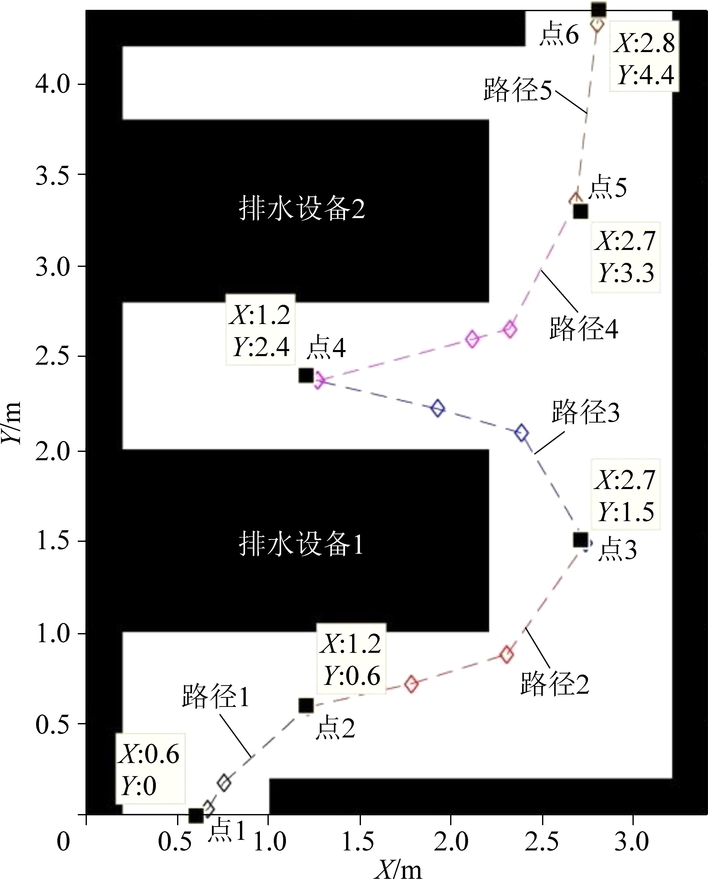 如图5所示,点1和点6分别为水泵房巡检任务中的起始点和最终点,他们处于水泵房入口和出口的中间位置,此处障碍物较少,便于机器人通行;点2和点4是水泵房巡检任务中的检测点,检测点设置在排水设备的中间位置,方便机器人对排水设备中水泵、电机、联轴器、转轴进行拍照、红外测温和噪音检测;点3和点5是水泵房巡检任务中的行进点,行进点设置在水泵房走廊的中间位置,其作用是给路径规划算法增加约束,让该算法规划的全局路径位于障碍物较少的位置。由于水泵房内各排水设备的位置相对固定,所以点1~点6坐标位置可通过实地测量确定下来,机器人路径规划算法根据这些坐标点便可规划出一条合理的全局路径。