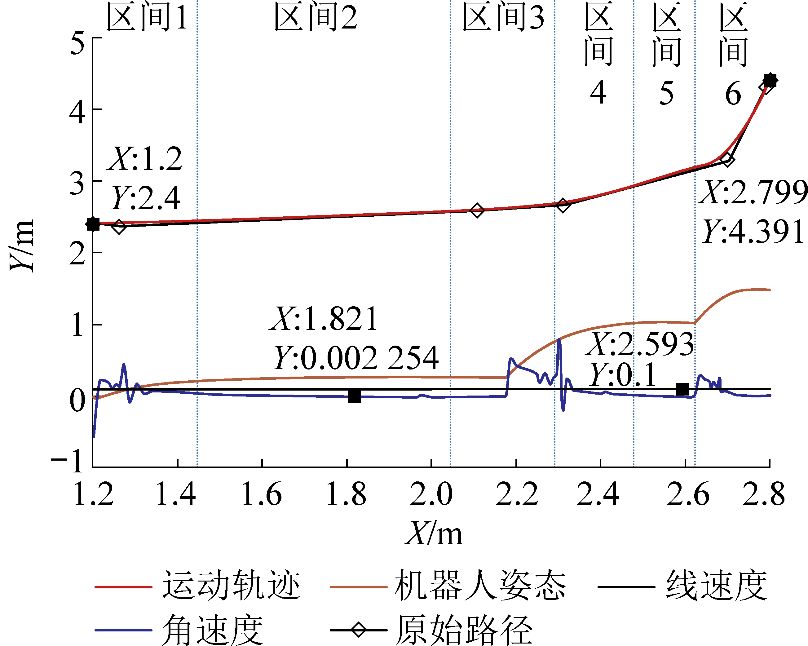 图15为Pure Pursuit路径跟踪算法控制机器人跟踪路径4和路径5时各个时刻的姿态角、角速度和线速度的变化,在区间1内机器人处于起始点,位姿(x,y,θ)=(1.2,2.4,0),规划路径姿态角(规划路径与全局坐标系X轴间夹角)大于机器人的姿态角(机器人坐标系的X轴与全局坐标系的X轴之间的夹角),因此Pure Pursuit路径跟踪算法给出的机器人旋转角速度大于0,机器人逆时针方向旋转,机器人的姿态角增加,在区间2内机器人的姿态角与规划路径姿态角相等,Pure Pursuit路径跟踪算法给出的机器人旋转角速度等于0,线速度为0.1 m/s保持不变,机器人将沿着规划路径移动。在区间3内由于规划路径的姿态角进一步增大,因此Pure Pursuit路径跟踪算法给出的机器人旋转角速度大于0,机器人逆时针方向旋转,机器人的姿态角也增大。在区间4内机器人的姿态角与规划路径姿态角相等,Pure Pursuit路径跟踪算法给出的机器人旋转角速度等于0,线速度仍保持不变,机器人沿着规划路径移动。同理在区间5内也发生了规划路径姿态角的改变,同时Pure Pursuit路径跟踪算法也给出了机器人不同的旋转角速度,使机器人的姿态角最终与规划路径的姿态角相等。在区间6内机器人到达规划路径的最终点,此时线速度和角速度都为0,机器人的最终的姿态角仍和规划路径姿态角相等。