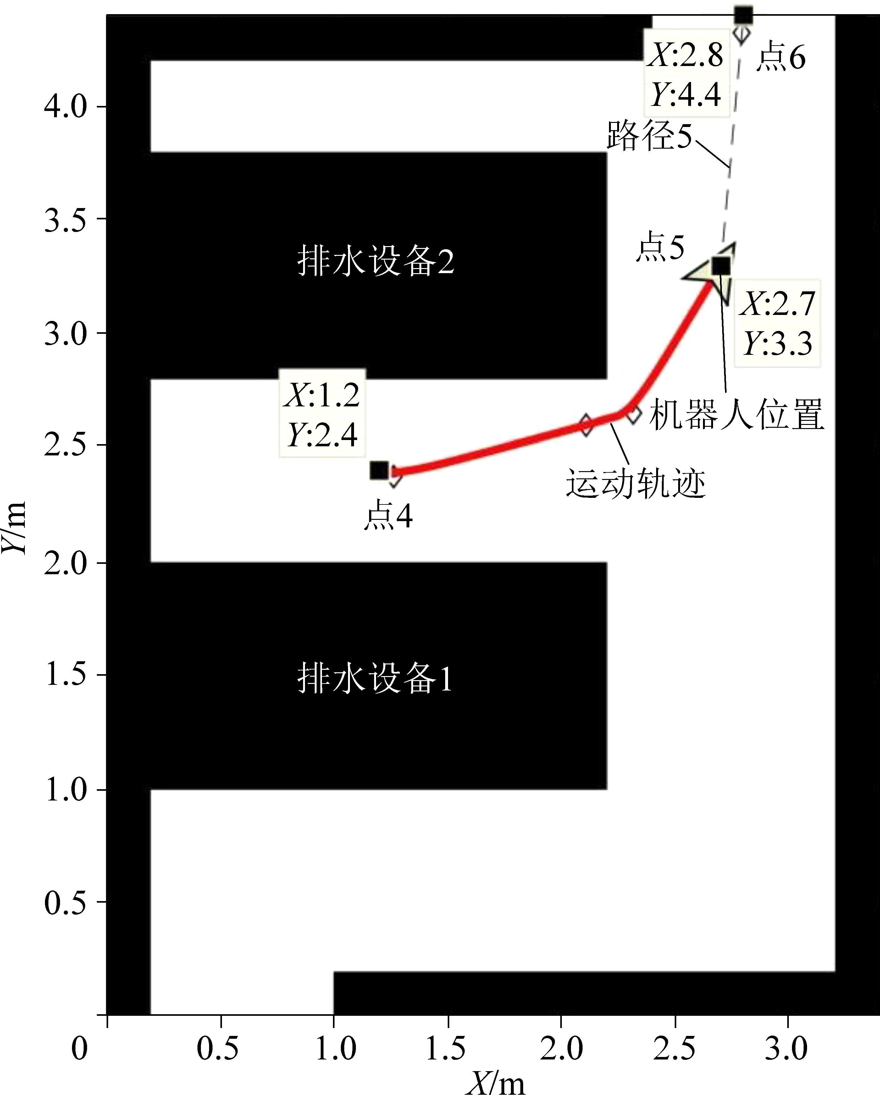 由图13看出轨迹1、轨迹2和轨迹3与PRM路径规划算法生成的路径基本重合。机器人从起始点(点1)跟踪路径1到达排水设备1的检测点(点2),机器人在此处停留一段时间采集排水设备1的数据,然后跟踪路径2和路径3到达排水设备2的检测点(点4),机器人在此处停留一段时间采集排水设备2的数据,最后跟踪路径4和路径5到达最终点(点6)。重点介绍Pure Pursuit算法控制移动机器人跟踪路径4和路径5(点4~点6)。在进行路径跟踪前要在MATLAB中生成一个两轮差速机器人模型,设置机器人的直径为0.2 m,该机器人可通过里程计得到任意时刻全局坐标系下的位姿,该位姿可以判断机器人是否到达了目标点;再把点4~点6的规划路径存储到Pure Pursuit路径跟踪算法中,点4到点6的规划路径由一些坐标点连线组成,这些坐标点是由PRM算法生成的,他们是Pure Pursuit算法需要跟踪的目标点;设置机器人进行路径跟踪时的线速度0.1 m/s,最大角速度1 rad/s,距离阈值为0.01 m,执行Pure Pursuit算法得到的仿真结果如图14所示。