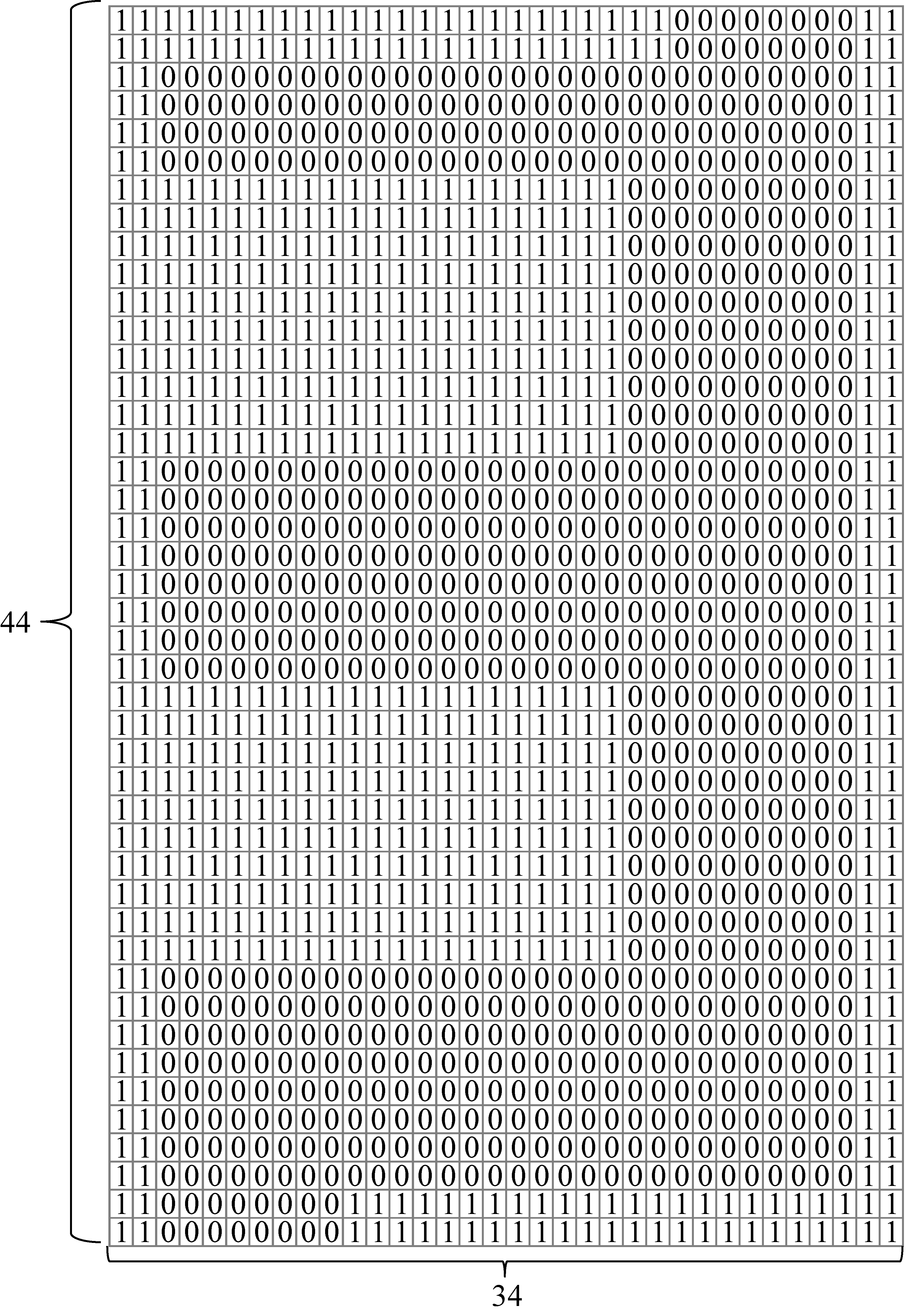 2)根据水泵房二维平面图将水泵房内的障碍物和可通行区域以数字化的方式表示成一个44行34列的矩阵如图2所示。在矩阵元素中0代表可通行区域,1代表障碍物区域。