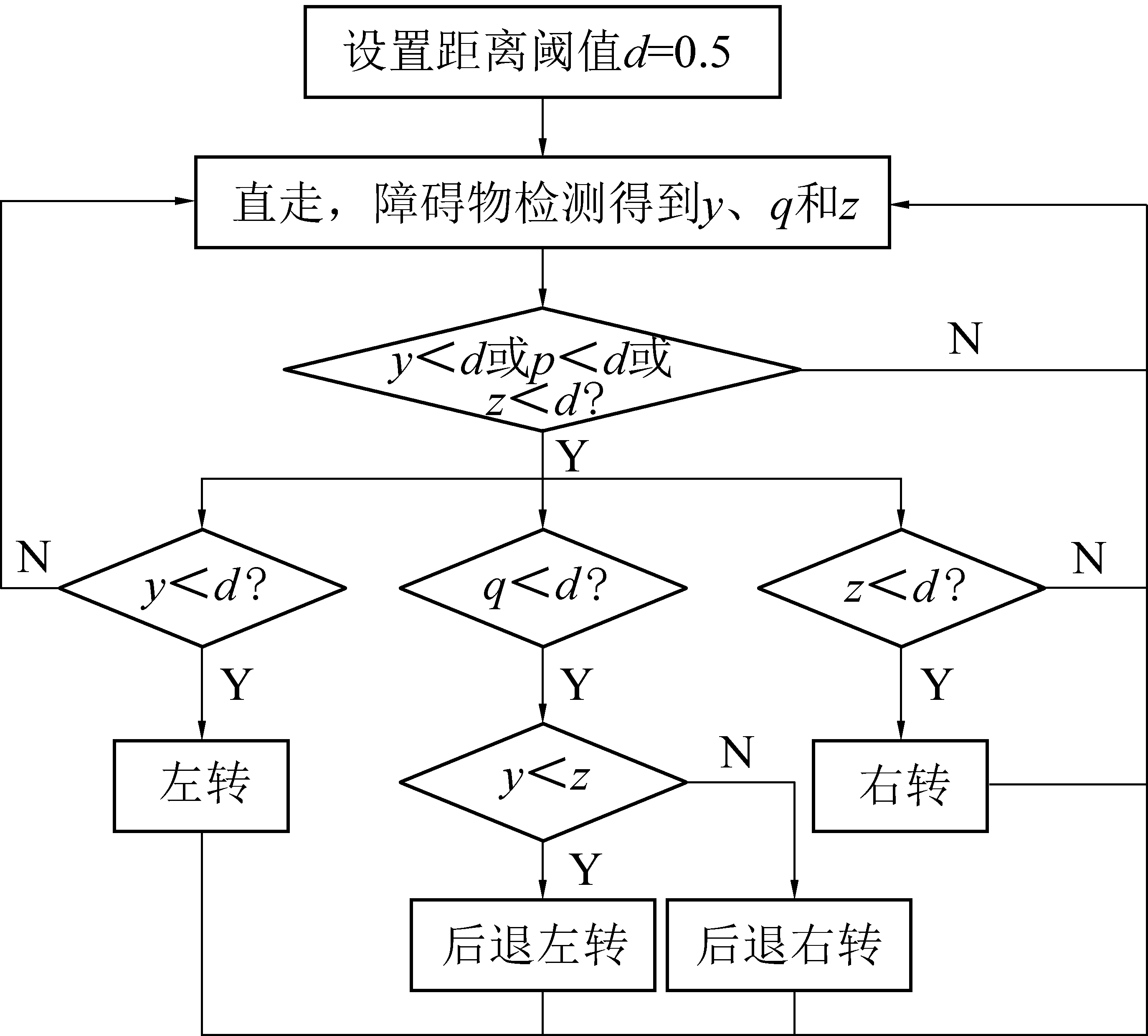 在机器人右方、前方和左方的每束激光测得的距离d中选取最小值,分别为y、q和z,避障算法流程如图9所示。