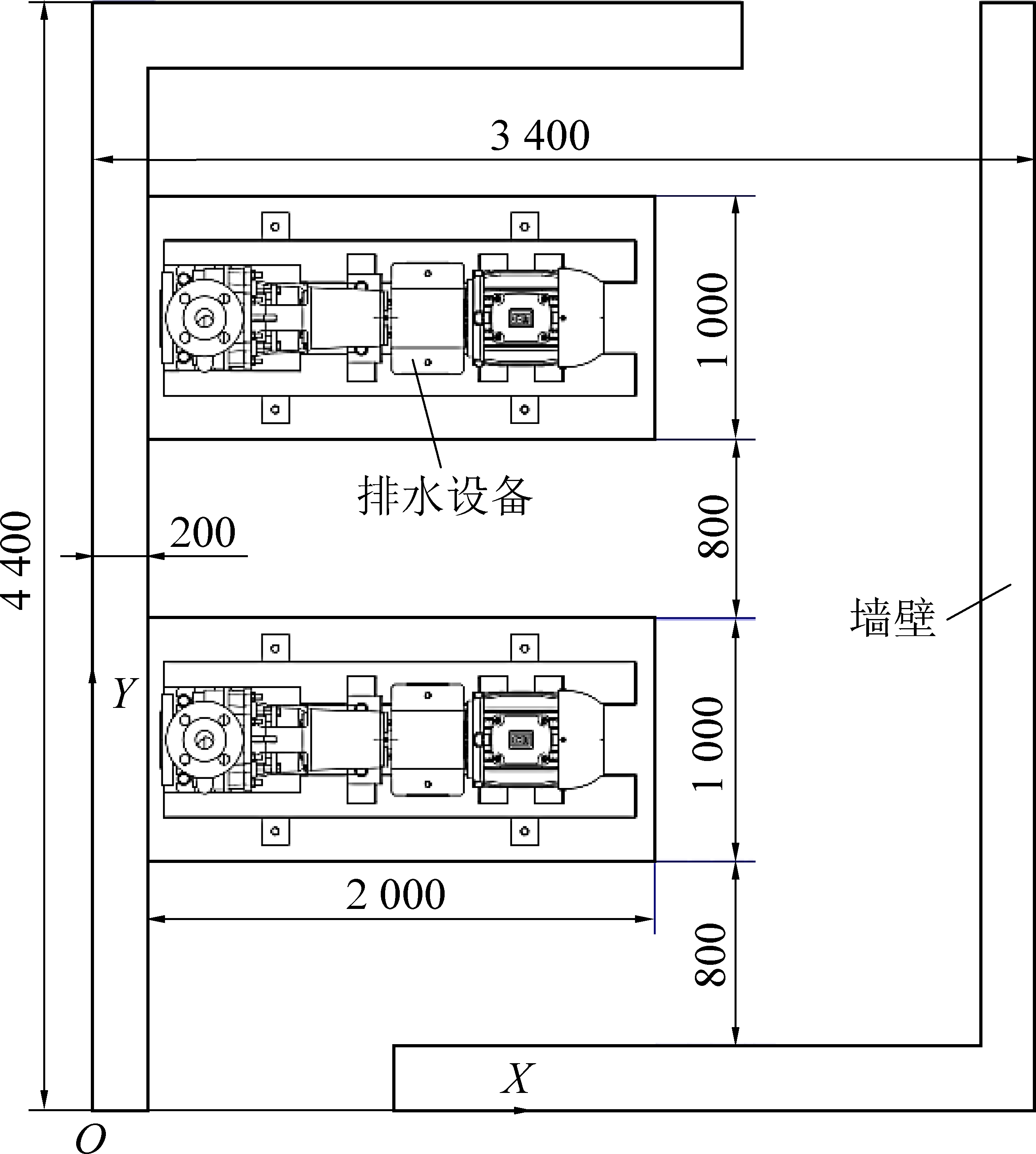 1)人工测量可得到水泵房的整体尺寸、排水设备的具体尺寸和排水设备在水泵房中的具体位置,根据这些信息绘制出水泵房二维平面图,如图1所示。