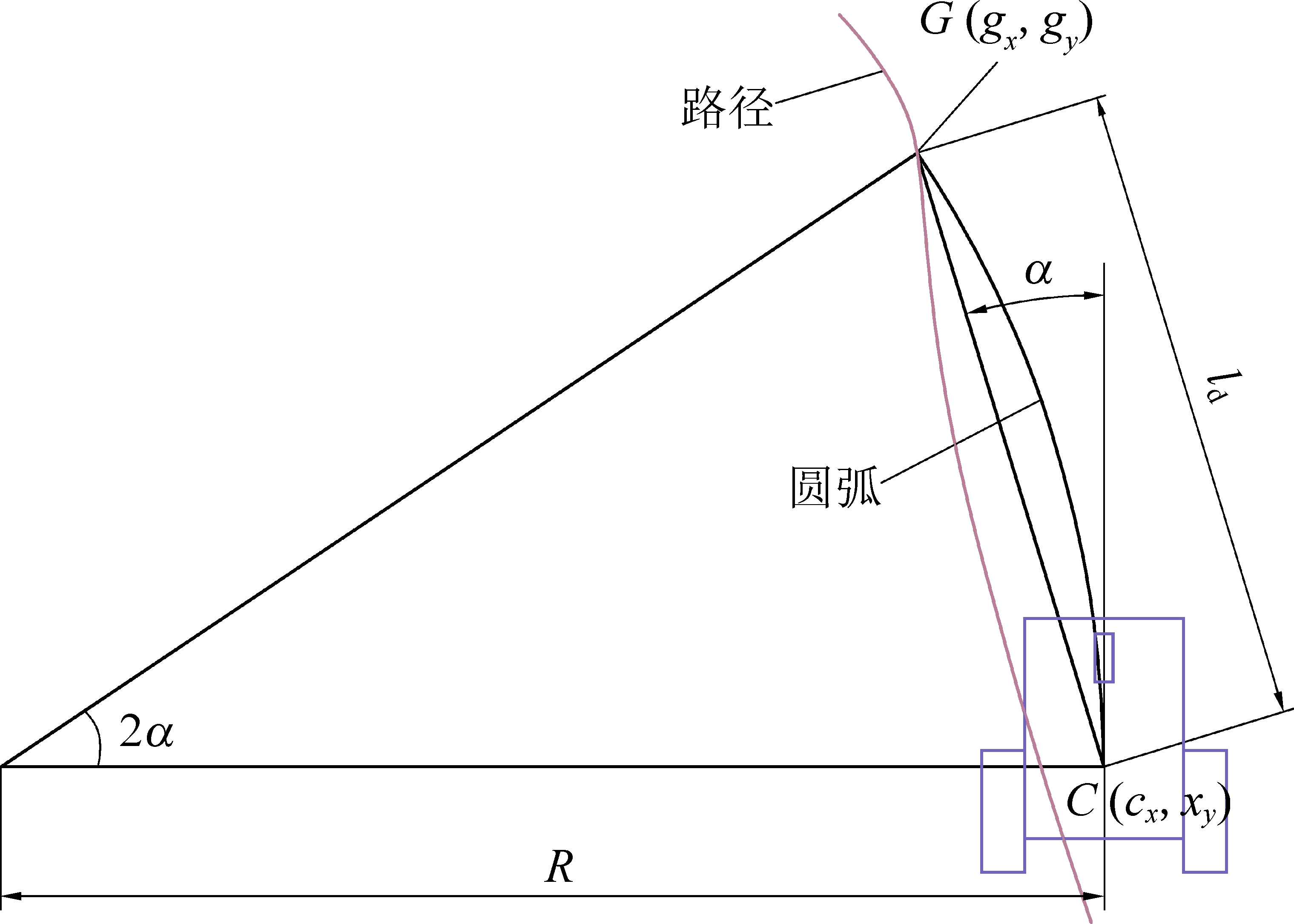 式中:ld为机器人位置参考点C距目标点的距离;α为机器人从当前位置运动到目标点需要转过的角度;R为机器人运动轨迹的圆弧半径。