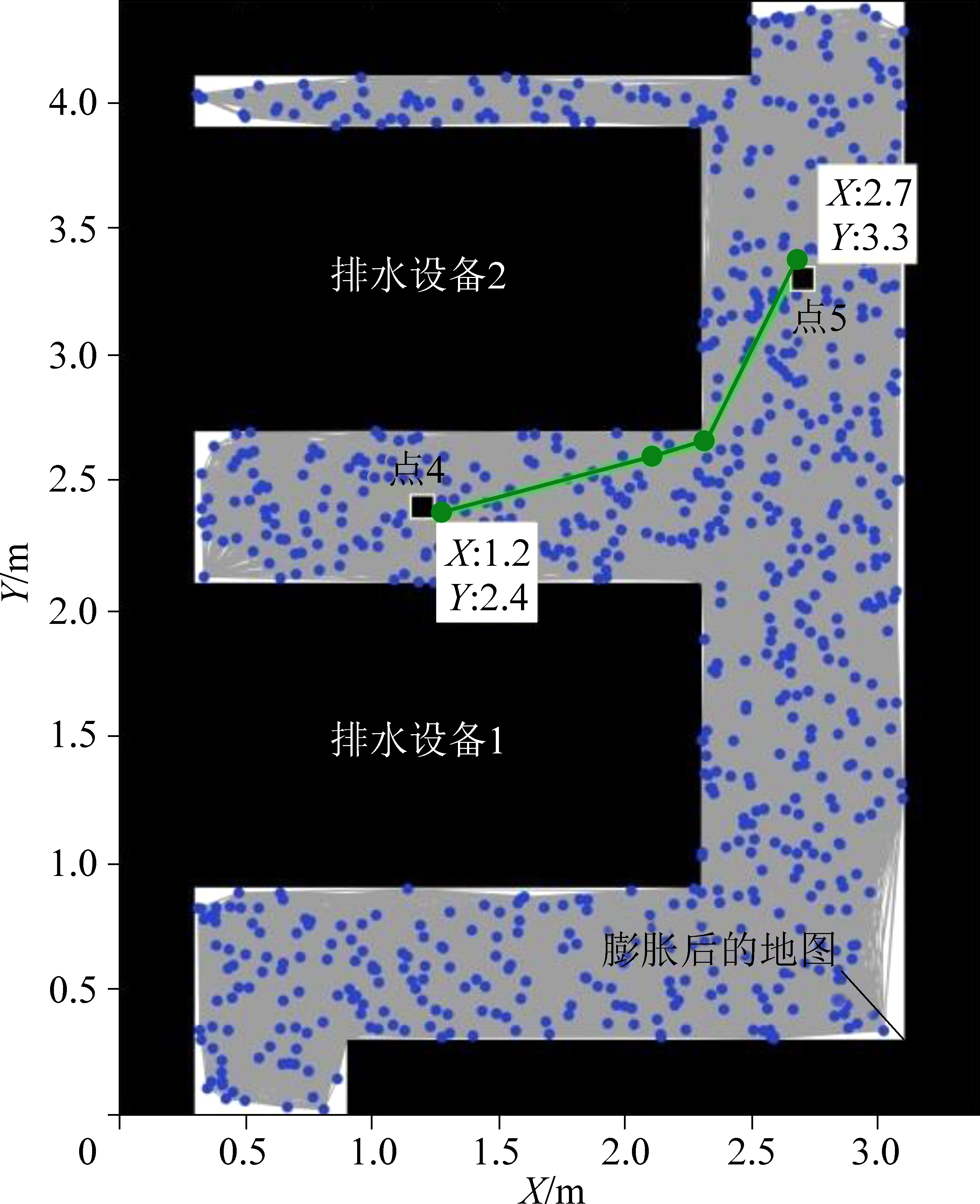 1)通过人工测量的方法在MATLAB中建立了水泵房二维栅格地图,并在此地图上根据巡检过程中设置的检测点和行进点利用PRM路径规划算法获得一条经过所有排水设备的全局路径。