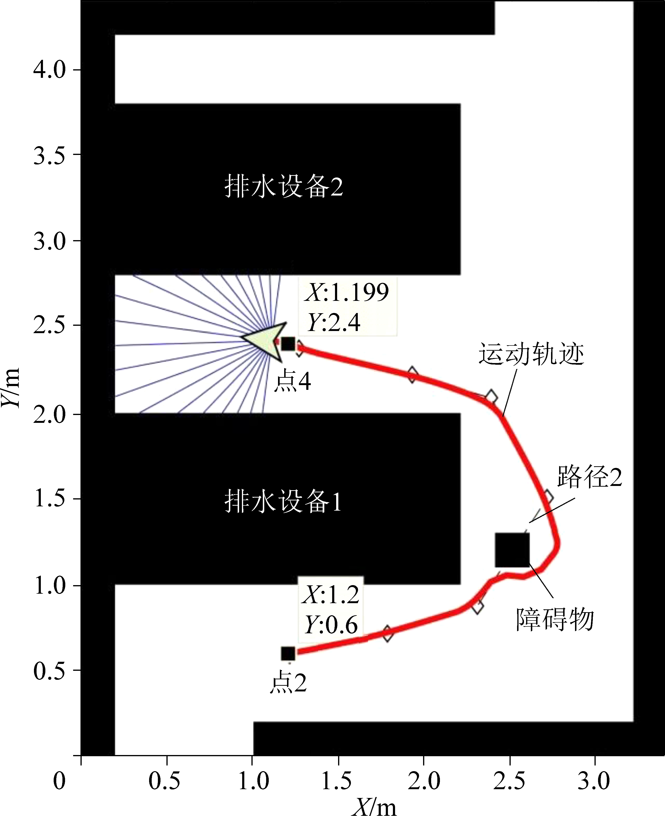 3)将巡检机器人置于水泵房模拟环境中,对其路径跟踪和避障的能力进行多次试验,最终结果表明:巡检机器人在进行路径跟踪时没有偏离规划的路径,到达巡检点后其位置的平均误差为4 cm,姿态角度的平均误差为0.095 rad。