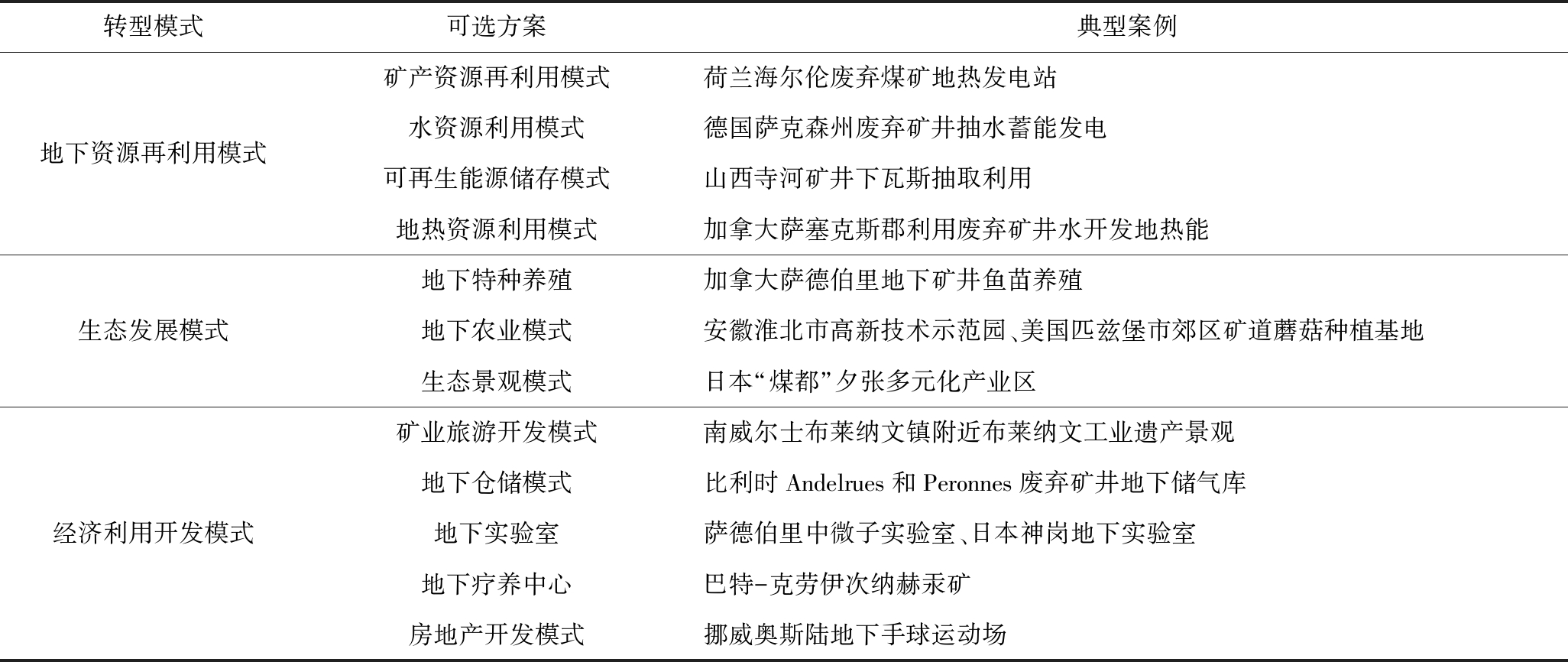 转型模式可选方案典型案例地下资源再利用模式矿产资源再利用模式荷兰海尔伦废弃煤矿地热发电站水资源利用模式德国萨克森州废弃矿井抽水蓄能发电可再生能源储存模式山西寺河矿井下瓦斯抽取利用地热资源利用模式加拿大萨塞克斯郡利用废弃矿井水开发地热能生态发展模式地下特种养殖加拿大萨德伯里地下矿井鱼苗养殖地下农业模式安徽淮北市高新技术示范园、美国匹兹堡市郊区矿道蘑菇种植基地生态景观模式日本“煤都”夕张多元化产业区经济利用开发模式矿业旅游开发模式南威尔士布莱纳文镇附近布莱纳文工业遗产景观地下仓储模式比利时Andelrues和Peronnes废弃矿井地下储气库地下实验室萨德伯里中微子实验室、日本神岗地下实验室地下疗养中心巴特-克劳伊次纳赫汞矿房地产开发模式挪威奥斯陆地下手球运动场
