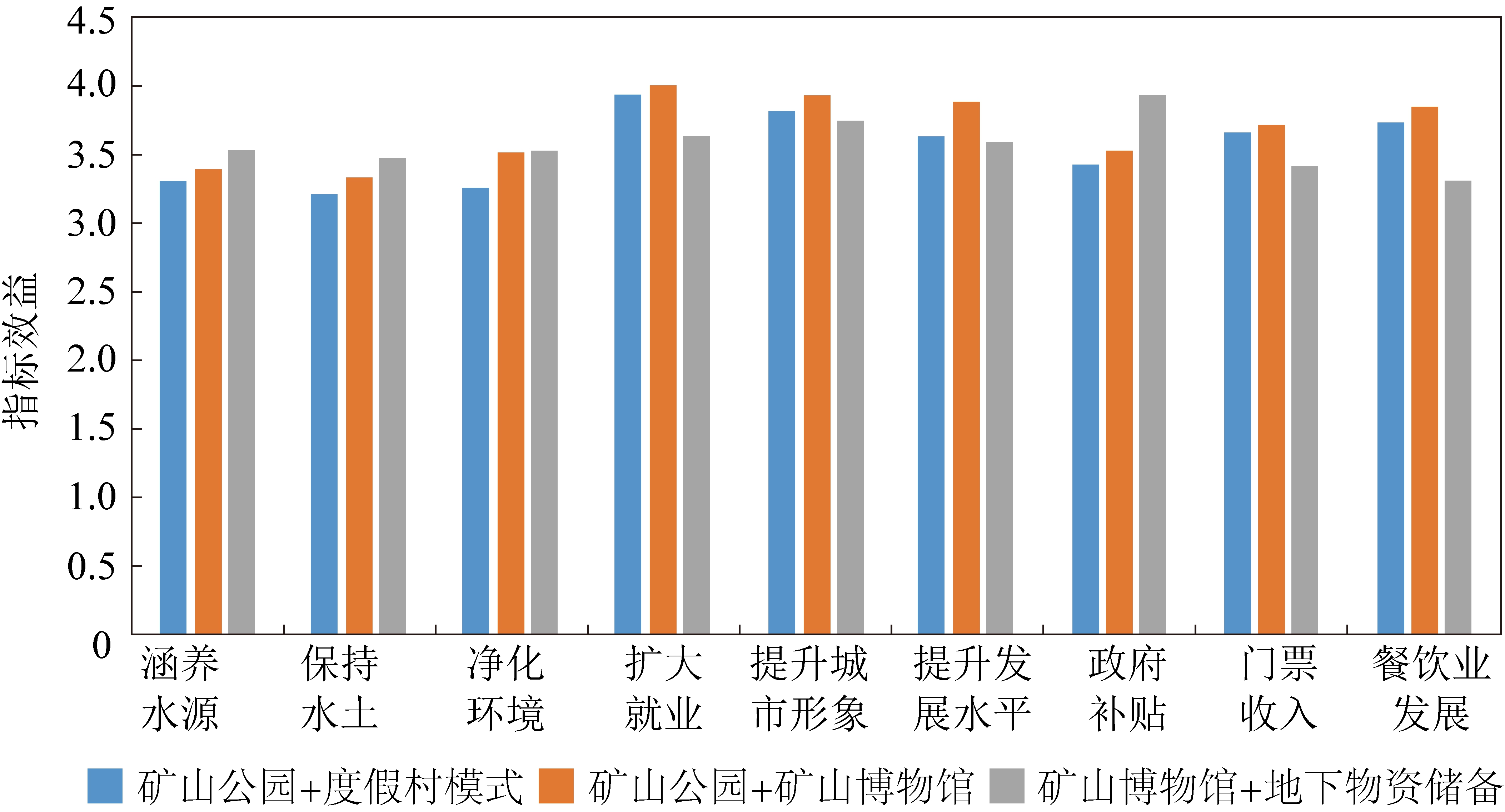 根据该矿的资源概况分析可知,其转型利用符合矿业旅游开发要求,依托周边旅游景区,该矿既可以做矿山公园,也可以利用矿区闲置建筑改建为休闲度假场所。不同开发利用模式带来的综合效益不同,综合效益最大化是具体利用方案选择的关键。利用层次分析法分析3种转型模式带来的综合效益,寻求该矿最佳转型方案。各指标效益值如图4所示。
