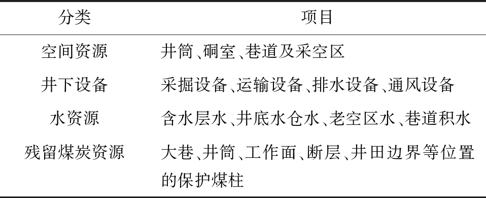 分类项目空间资源井筒、硐室、巷道及采空区井下设备采掘设备、运输设备、排水设备、通风设备水资源含水层水、井底水仓水、老空区水、巷道积水残留煤炭资源大巷、井筒、工作面、断层、井田边界等位置的保护煤柱