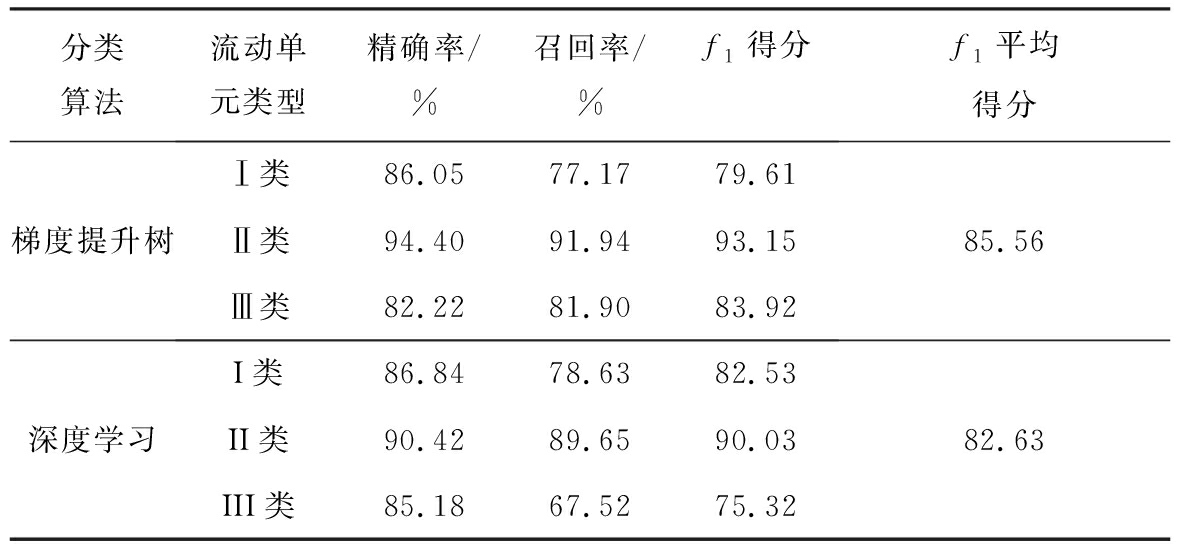 分类算法流动单元类型精确率/%召回率/%f1得分f1平均得分梯度提升树Ⅰ类86.0577.1779.61Ⅱ类94.4091.9493.15Ⅲ类82.2281.9083.9285.56深度学习I类86.8478.6382.53II类90.4289.6590.03III类85.1867.5275.3282.63
