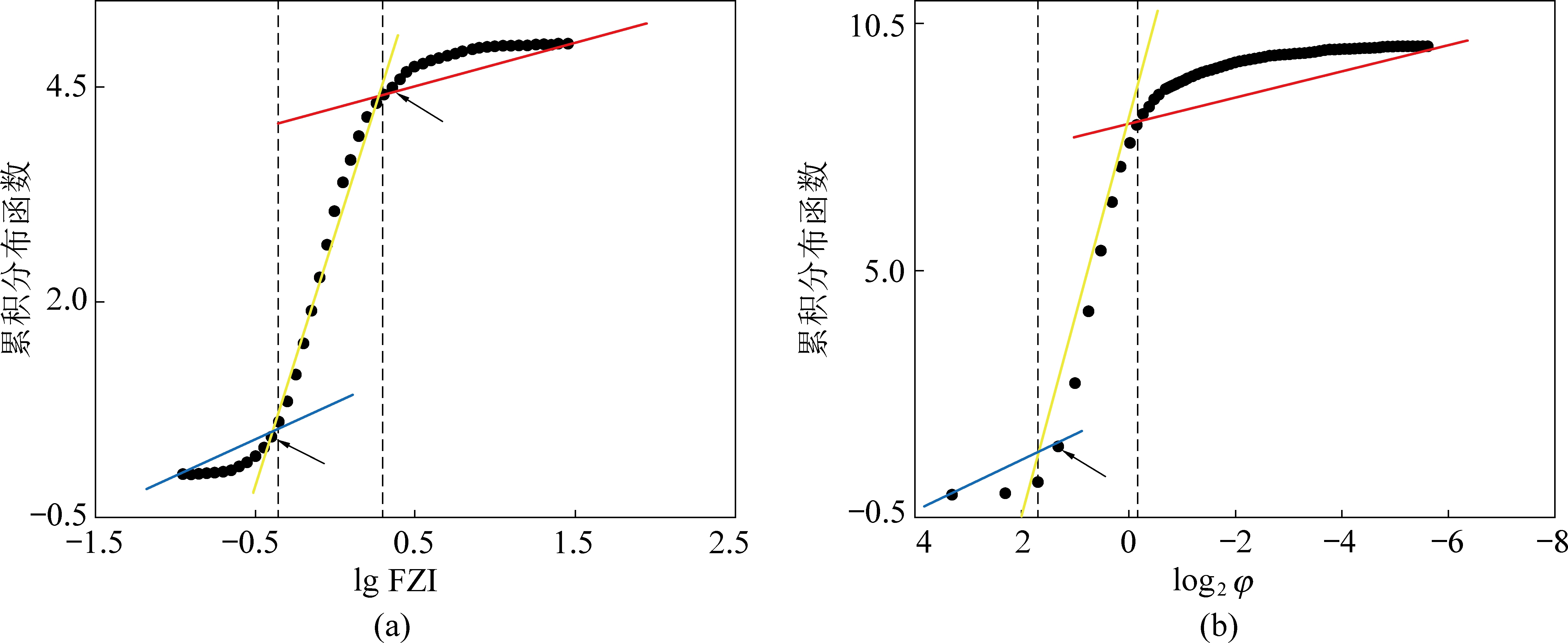 因此,利用式(3)和式(5)对研究区1 880组岩心数据分别计算了FZI和R35,在此基础上,进一步计算了lg FZI和R35的概率累积分布函数(Cumulative density Function)(图4)。