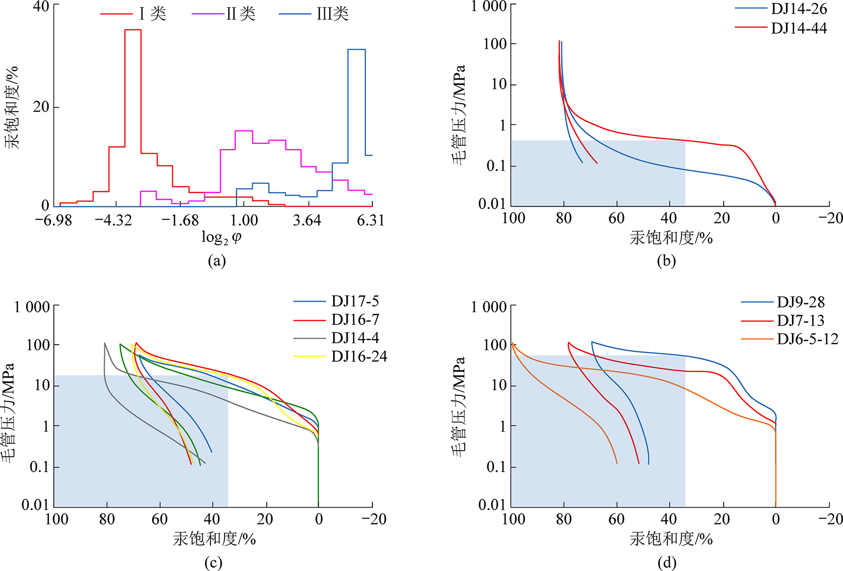 DJ7等关键井的33个岩心柱塞压汞数据表明,储集岩中值压力为1.0~5.5 MPa,平均值4.4 MPa,喉道系数5.272~12.180,中值为9.35;喉道分选系数1.414~5.109,中值2.56;结构系数0.122~108.100,中值0.28;偏度0.028~2.530,平均值1.51;平均孔喉半径为0.076~11.115 μm,中值0.28 μm;R35孔喉半径为0.016~10.036 μm,中值为0.2 μm,具有显著的小孔径、窄喉道的孔隙结构特征。根据上述特征可划分3种类型(图3a),第I类峰值孔径为8.0~11.9 μm,第Ⅱ类0.12~1.26 μm,第III类0.012~0.032 μm;相对应的35%进汞饱和度毛管压力约为0.9 MPa(图3b),20 MPa(图3c)和80 MPa(图3d)。