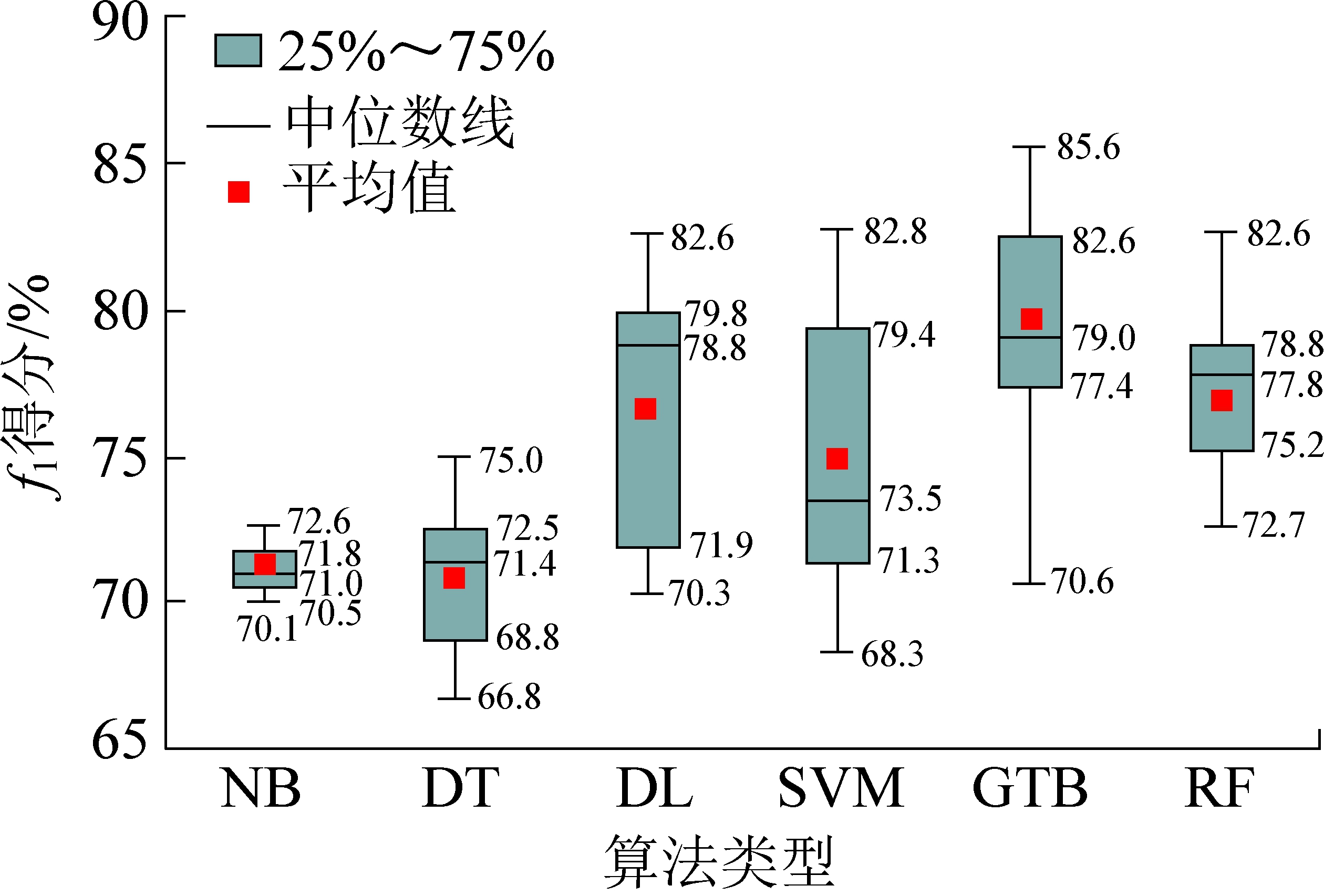 不同算法对于建模参数的敏感度不同,f1离散度越高就越敏感[28]。图7为6种有监督学习算法的不同建模参数组合f1得分值箱形图,在图7中,朴素贝叶斯f1分布最为集中,深度学习和支持向量机f1离散度最高,以决策树为基础的3种算法介于两者之间,说明深度学习和支持向量机2种算法对建模参数要求是最高的;此外,二者虽然最高和最低得分基本相同,但f1的中位数差异较大,深度学习为78.8%,而支持向量机仅73.5%,说明后者只有少数参数组合有较好的分类表现,算法对参数依赖性强,稳定性较差。