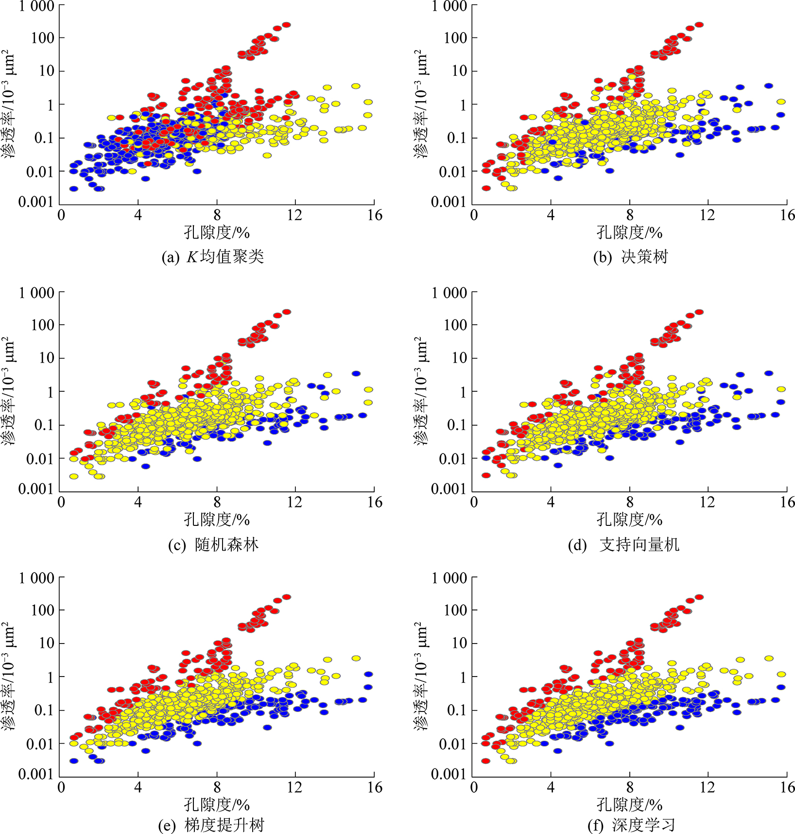 图8为无监督学习K均值聚类方法与其他5种有监督学习的最终分类效果对比图,与图5相同,红色样点代表Ⅰ类流动单元砂岩,黄色为Ⅱ类,蓝色为Ⅲ类。可见,有或无监督学习这2类机器学习模型的样点分布特征大相径庭, 5种有监督学习算法的样点分布与图5相近,而K均值聚类模型结果与FZI分类基本不相关。这一现象说明同样基于数据驱动,以消极学习为特征的K均值聚类只有在数据本身与分类目标期望契合的特定情况下,才可能实现理想分类;而以深度学习为代表的积极学习算法,在类标签的约束下,对隐含规则或关系的泛化能力更强,知识挖掘能力更高。因此,如若应用无监督的机器学习算法对流动单元进行分类,训练测试数据集的构建至关重要;而有监督的、积极的学习方法不需要对数据集进行针对性处理,学习门槛低,效率更高。