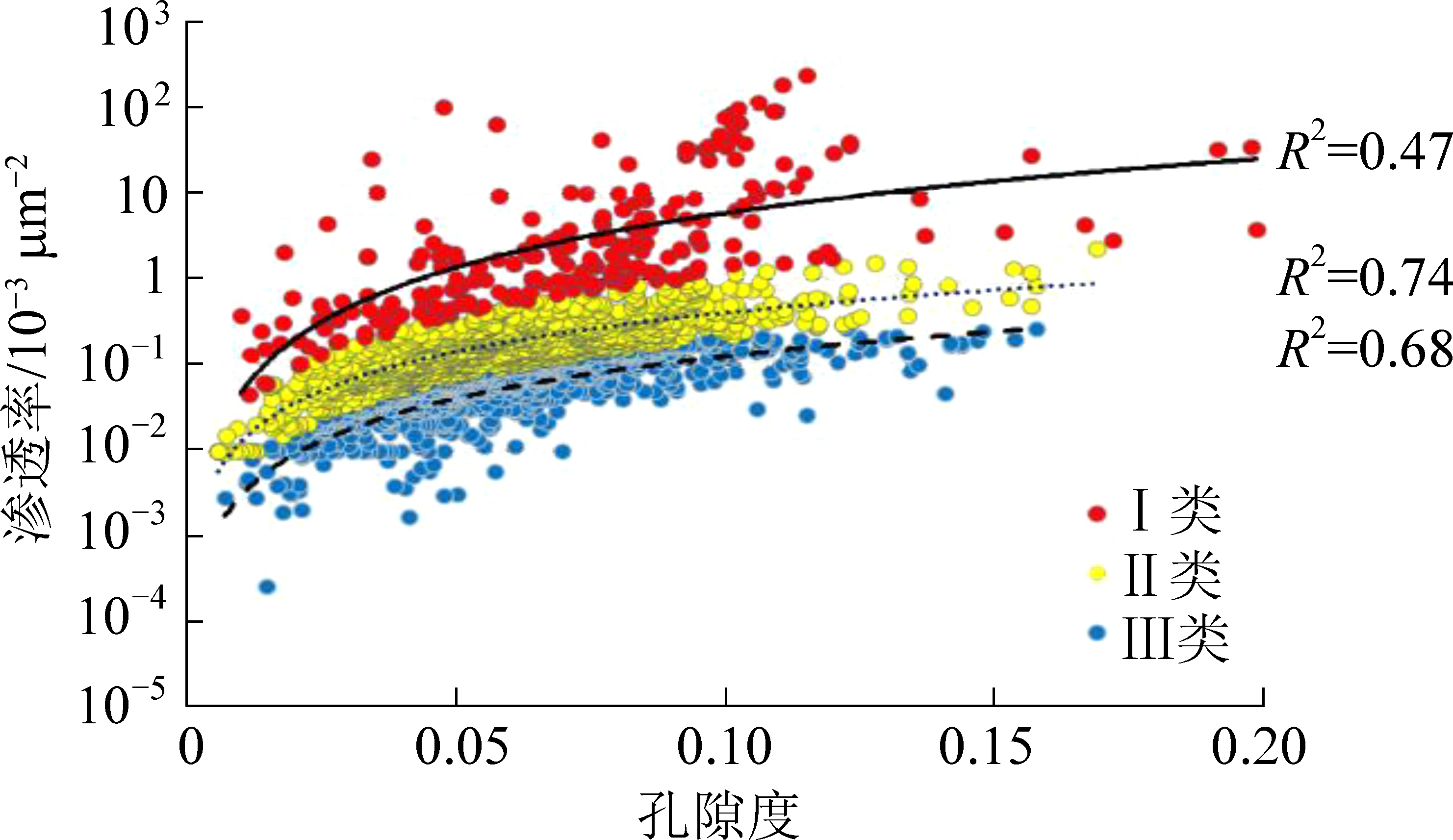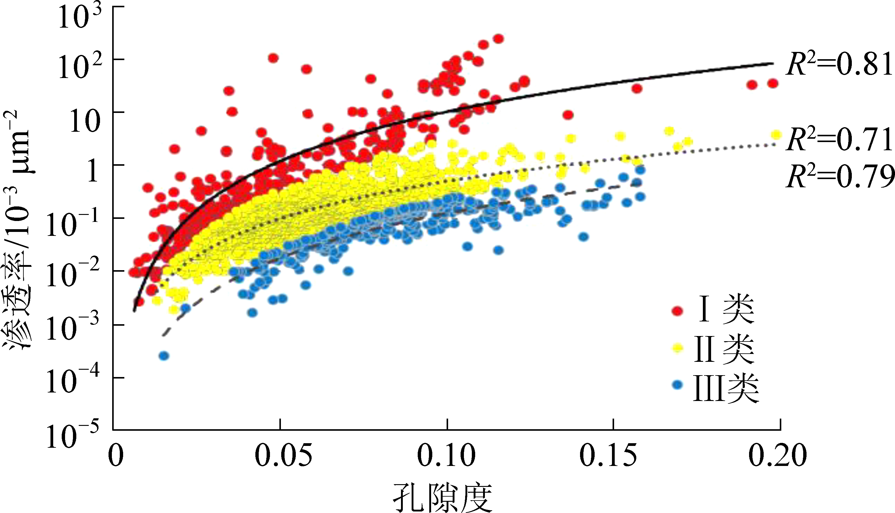 根据表2中流动单元划分标准,将3类单元中的所有样本投影到φ-lg k坐标系,如图5和图6所示。渗透率的孔隙度一元回归模型见表2。通过对比可以发现:① 各类流动单元内孔隙度与渗透率的相关性显著提升,仅有一个单元的R2小于0.5,其余为0.68~0.81(表2)。说明FZI和R35两种流动单元分类法均能反映微观孔隙结构的变化,且同一流动单元内的样本具有相近的孔喉特征;② 在同一单元内,随着孔隙体积比的增加,渗透率呈幂指数增大;③ 相同孔隙体积条件下,FZI和R35值越大,孔喉半径和渗透率越大,具有I类>II类>III类单元的变化规律;④ FZI和R35两种分类方案的主要差别在于第I类单元,R35划分结果中孔渗相关度仅为0.47,相对于FZI的0.81明显变差。因此,本次流动单元分类最终采用了基于流动层段指数FZI的划分方案。