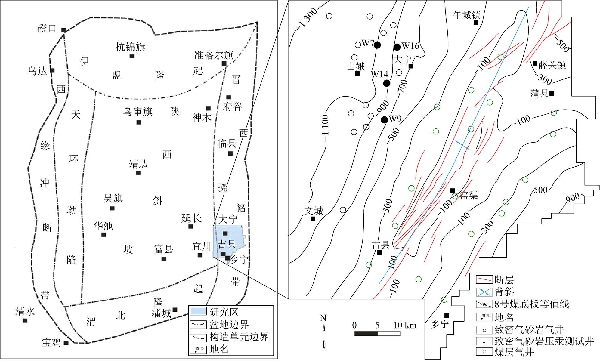 研究区位于鄂尔多斯盆地东部晋西挠褶带中南段(图1),整体为一倾向NW的单斜构造,地层走向及主要构造轴向均呈NNE向;构造变形较弱,仅东部有古驿-窑渠背斜、薛关-峪口断层带等;主要储集层段位于含煤系地层内,为一套稳定地台构造背景上的浅海陆棚—三角洲-河流、湖泊充填沉积,包括本溪组,太原组、山西组和下石盒子组,埋深为1 500~2 500 m;发育有多套煤及煤线,且富含有机质的暗色泥岩,泥灰岩等优质烃源岩;上石盒子组发育一套稳定的厚度约100 m的湖相泥岩,盖层条件较好。本区块虽然从早白垩世以来持续抬升剥蚀,仍然保留了可观的致密气资源,呈现准连续分布、源外成藏、近源聚集的特征[3];区内砂岩经历了压实压溶、不稳定组分溶蚀以及碳酸盐、硅质和黏土矿物胶结等多种成岩作用,现处于晚成岩阶段B期[26]。多类型、多期次、不同强度的成岩作用及其叠加对本区砂岩孔隙、裂隙的形成、保存以及破坏产生了极为复杂的影响。
